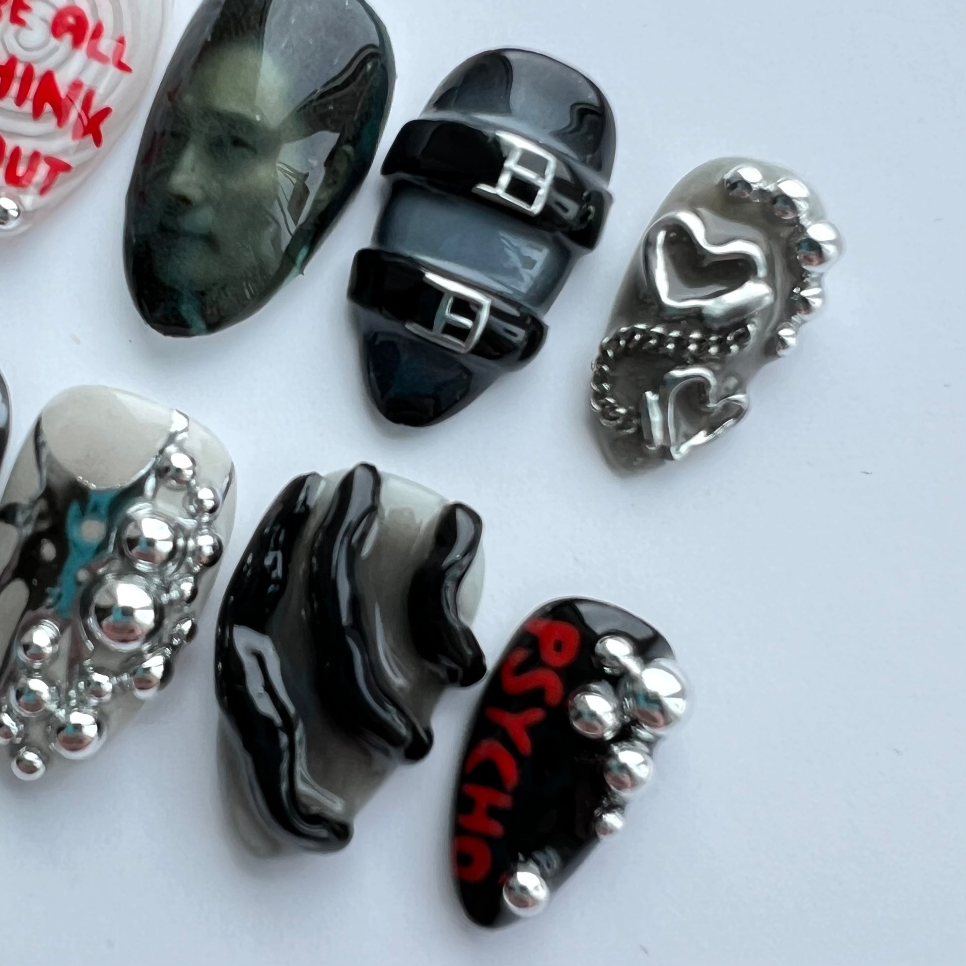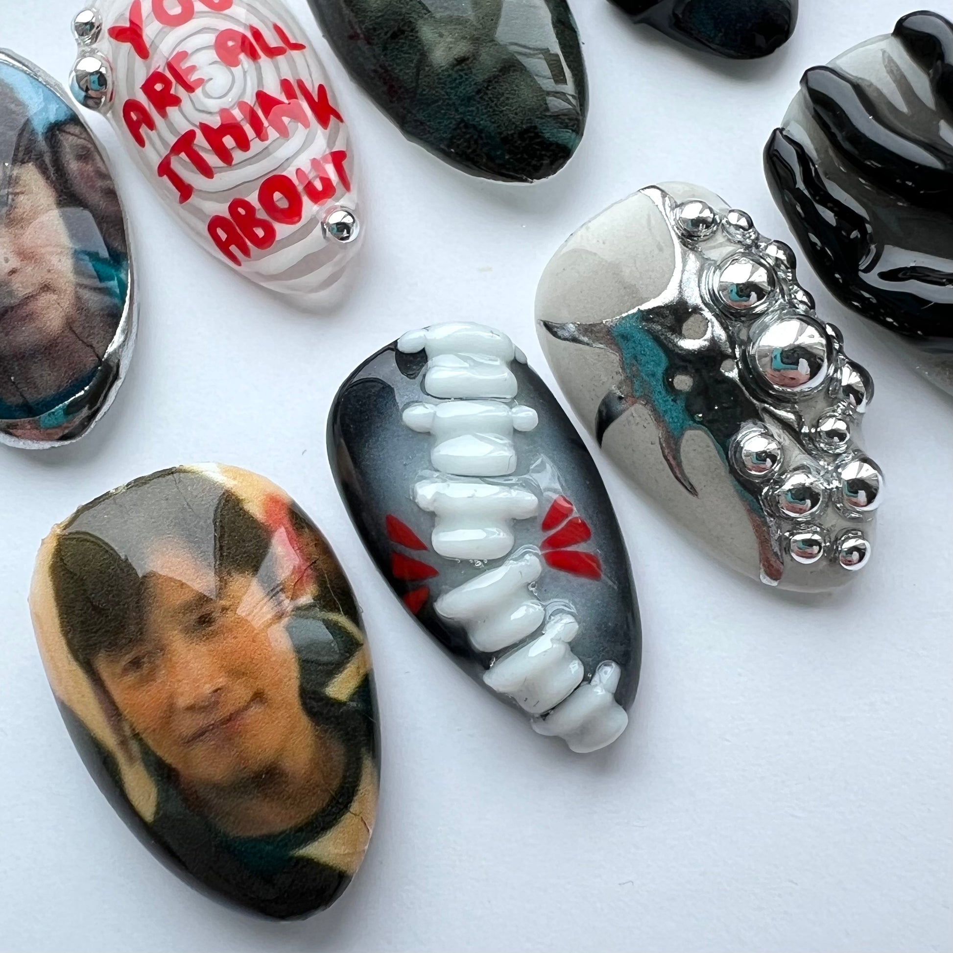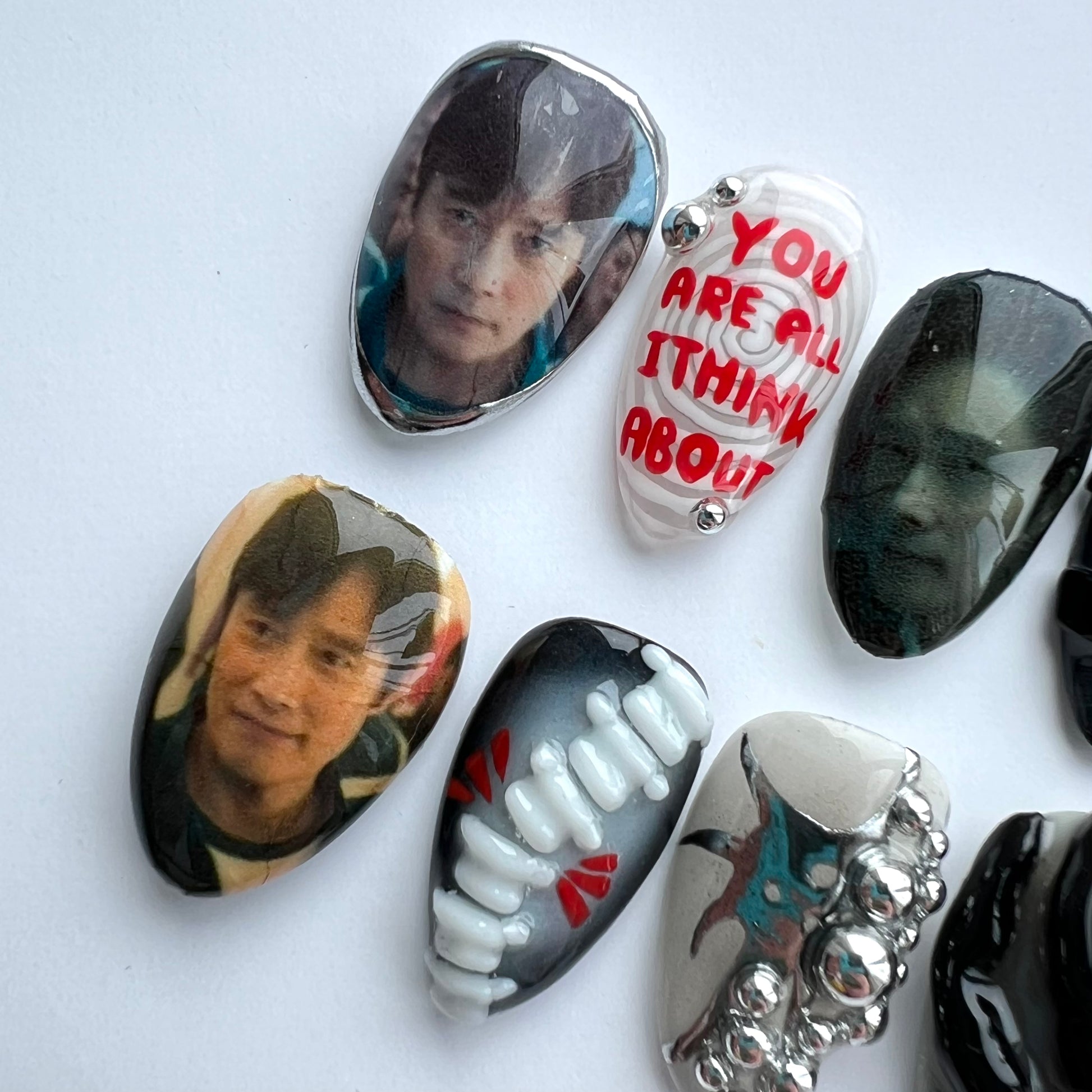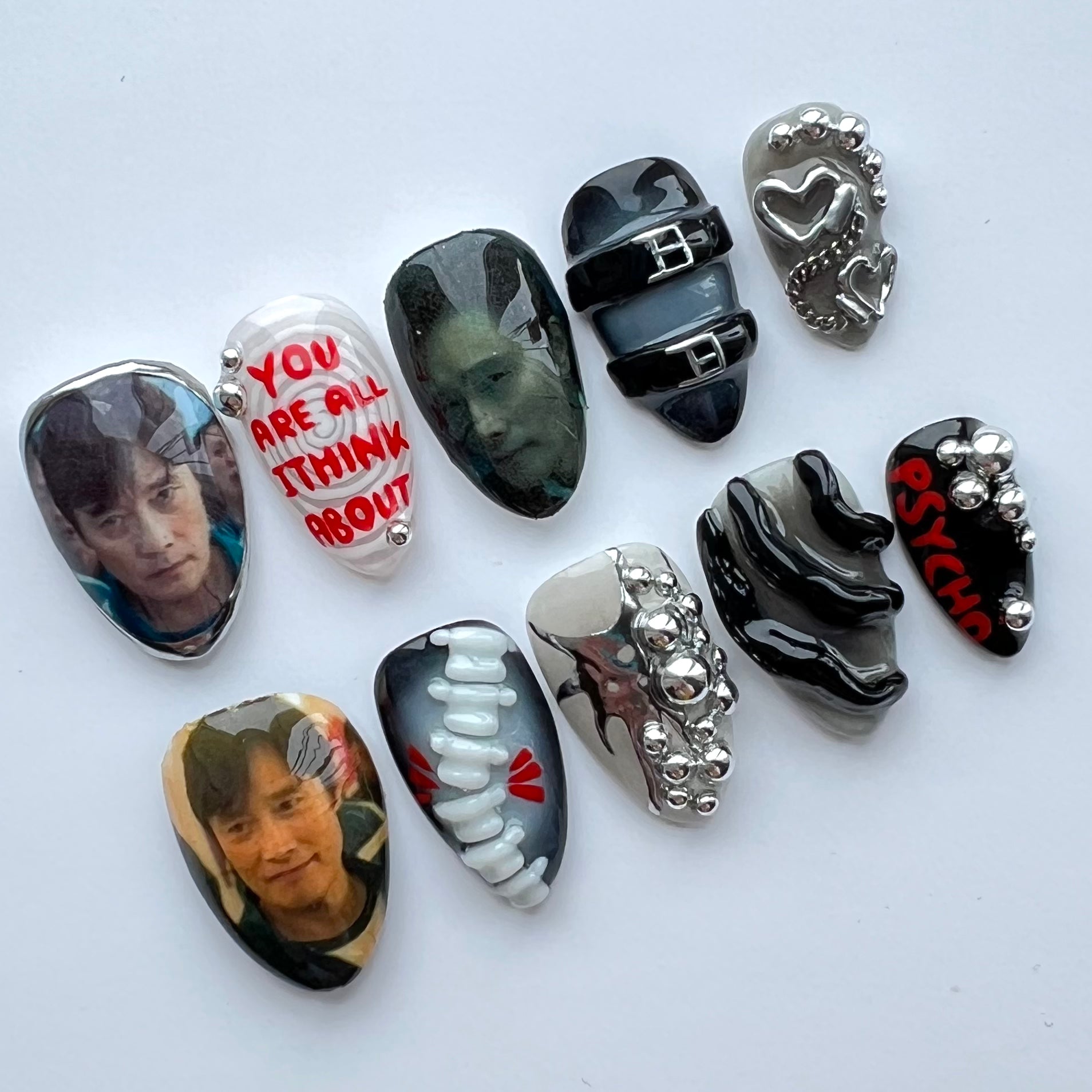Inspired by the Squid Game series and the vibes of Inho/Front Man/Young-il. Details include three water decal photo nails, hand sculpted elements such as the spine and handcuffs, black and white auras, hand painted swirls and lettering, silver chrome and charms.