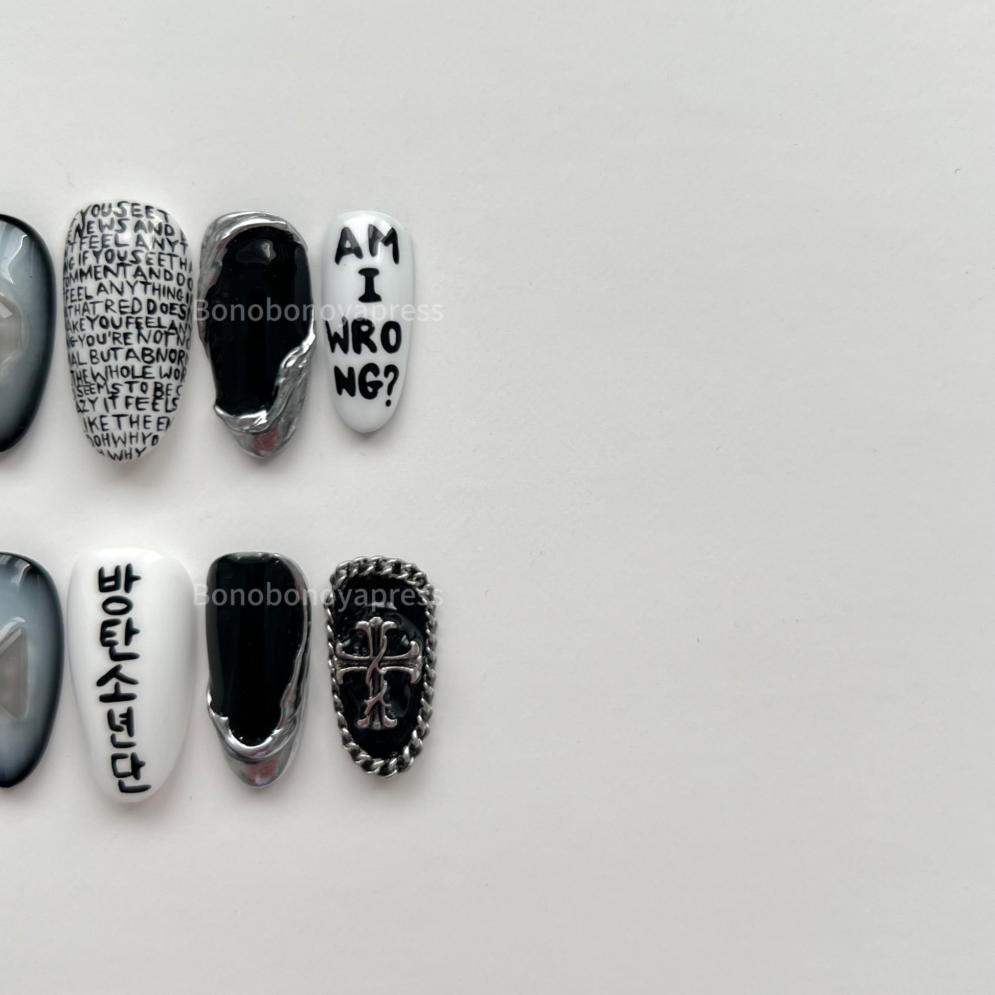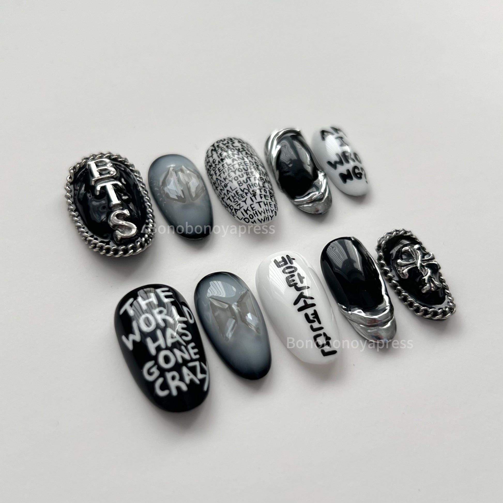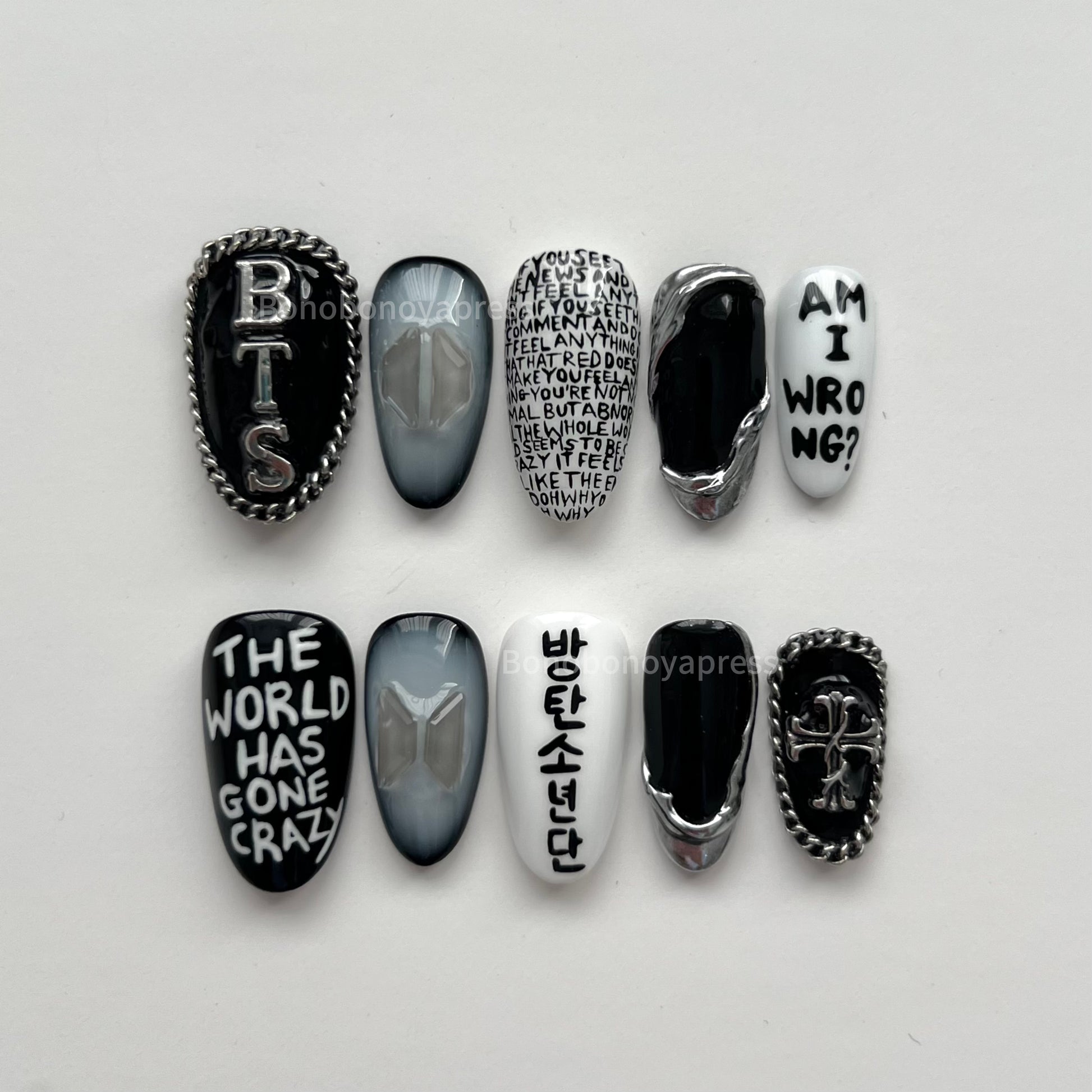 Inspired by BTS' song Am I Wrong. Details include black and white base colours, hand painted lyrics, silver chrome and charms.
