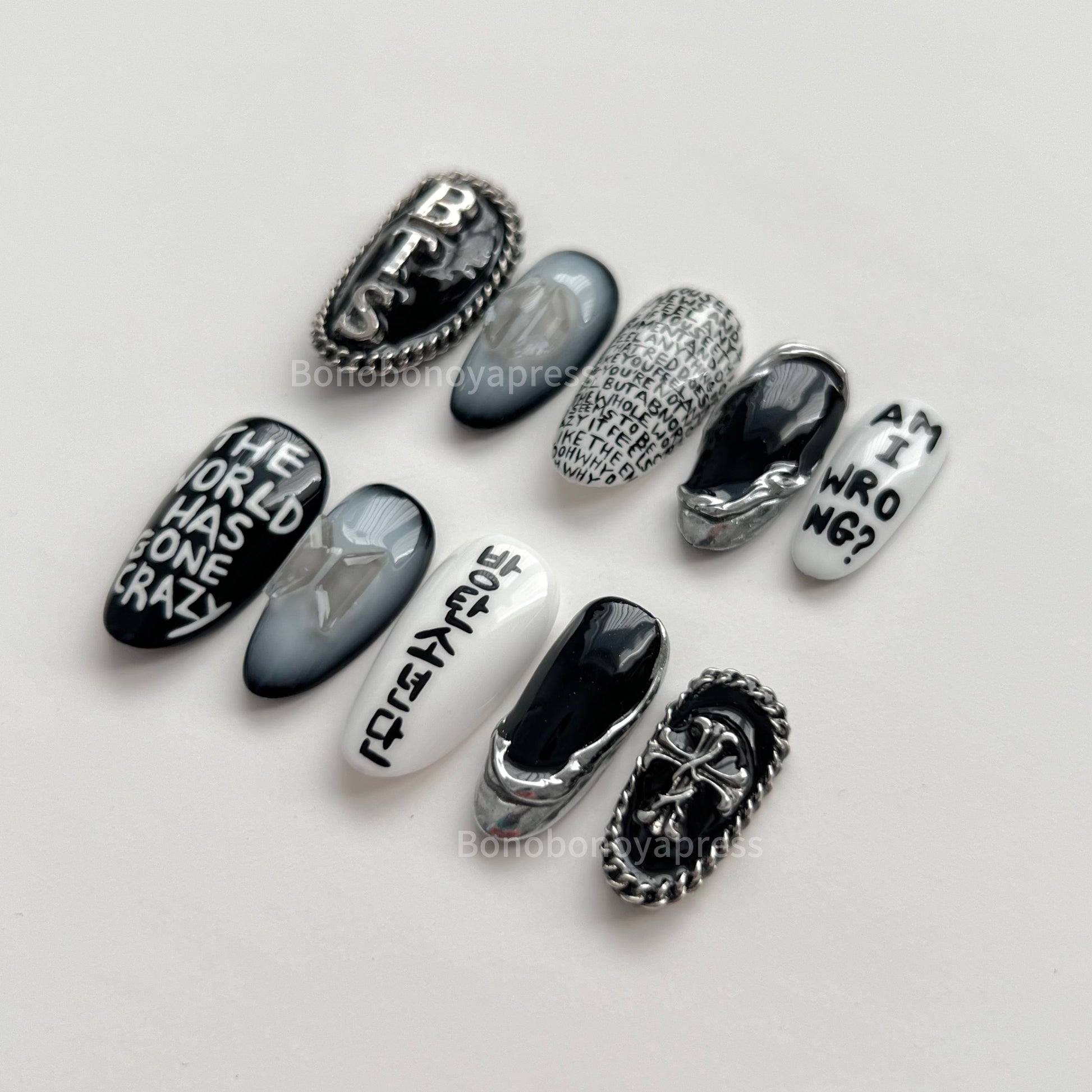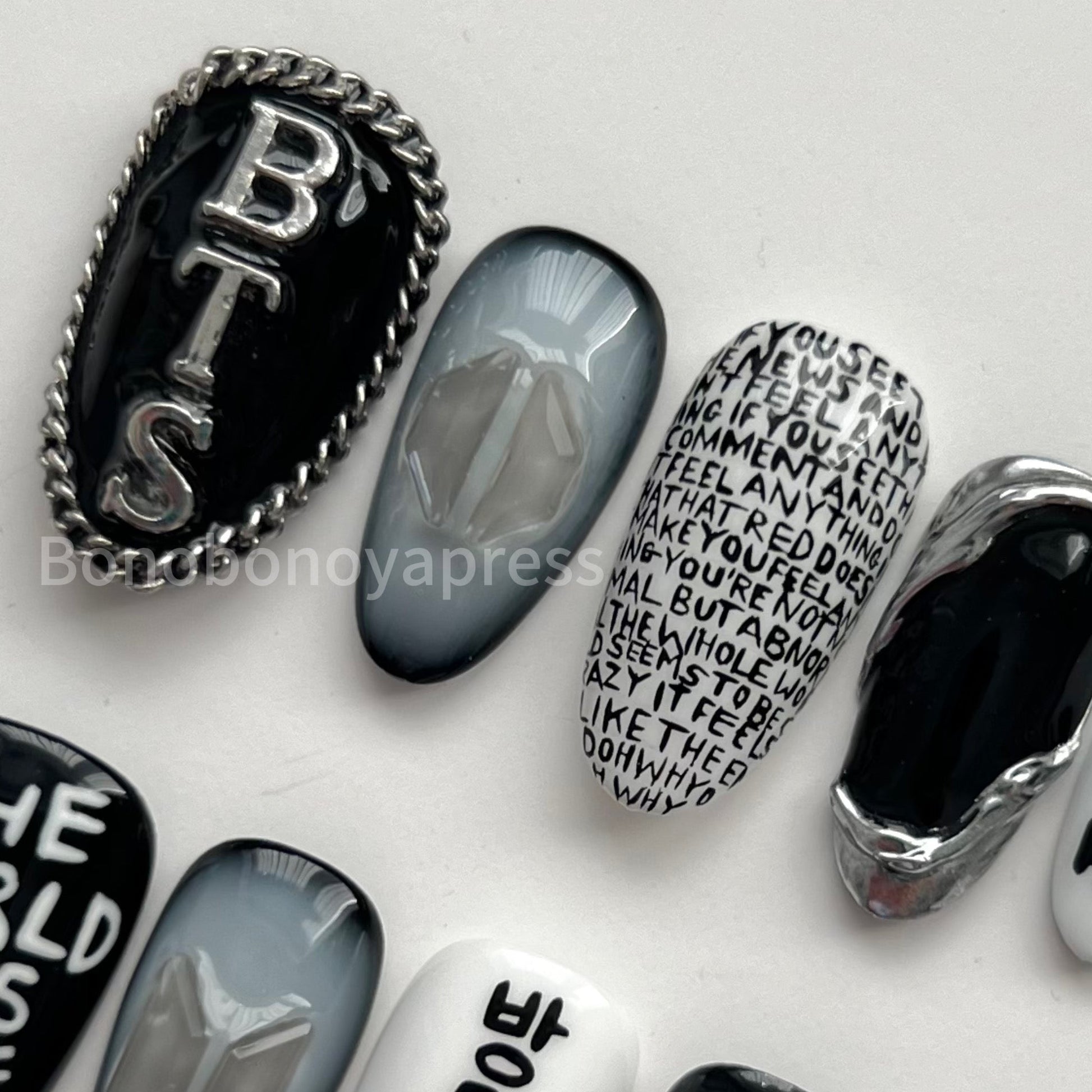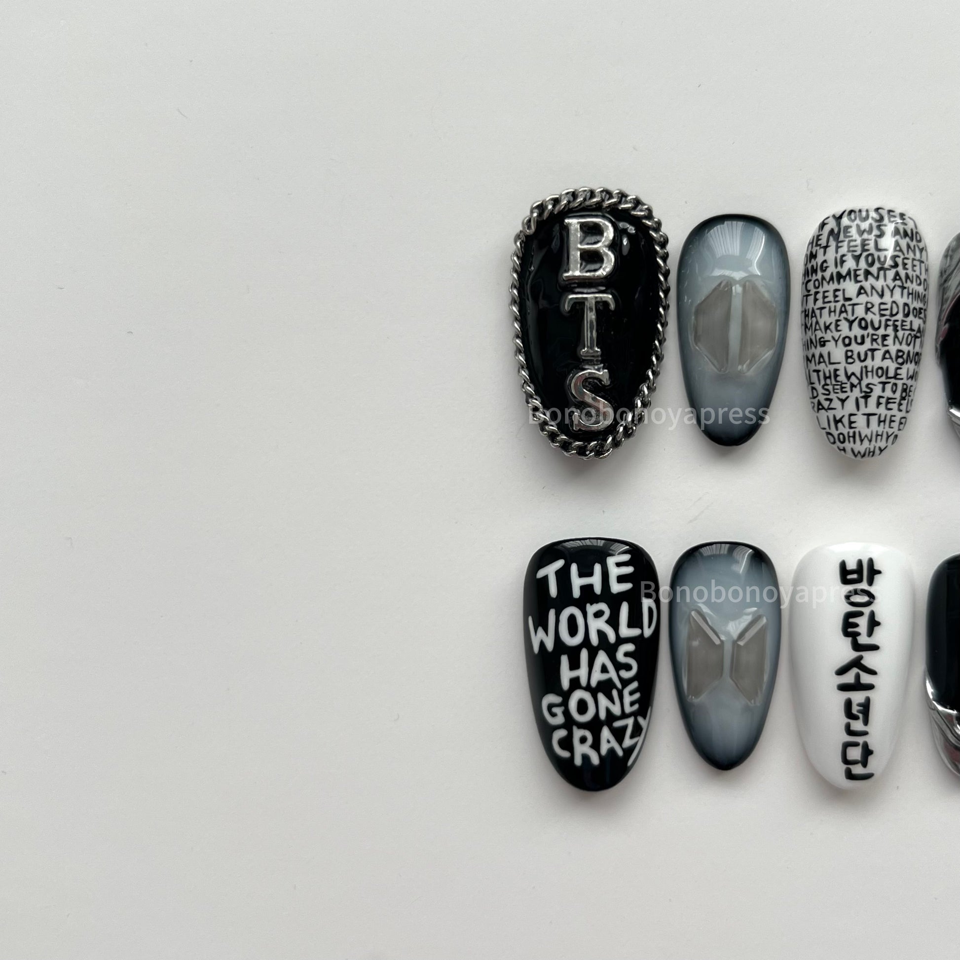 Inspired by BTS' song Am I Wrong. Details include black and white base colours, hand painted lyrics, silver chrome and charms.