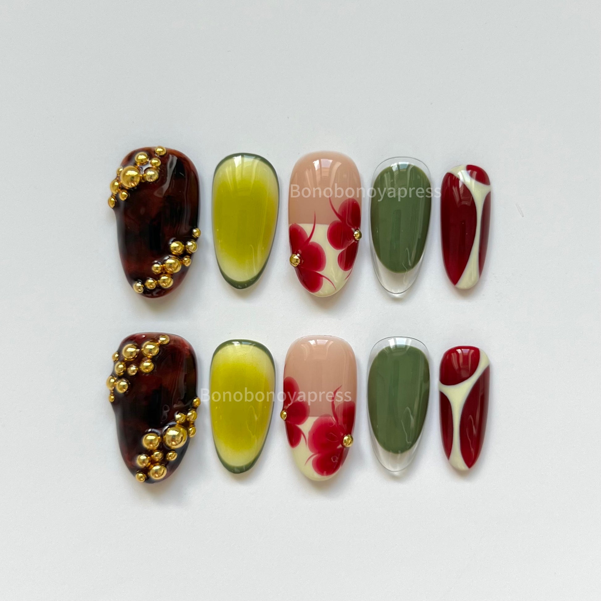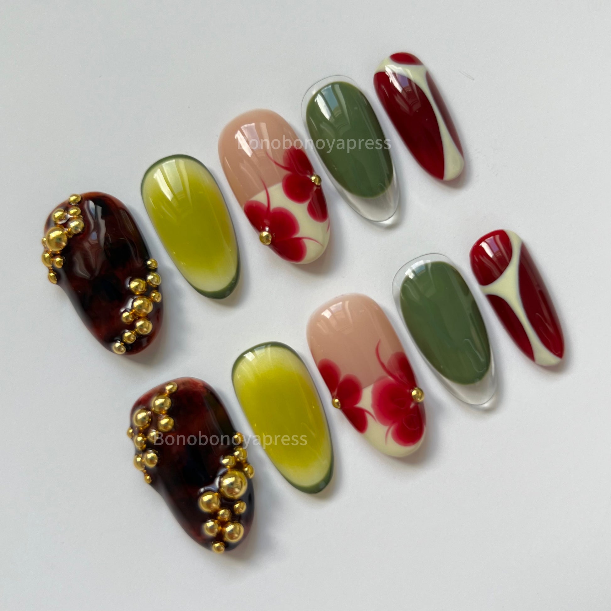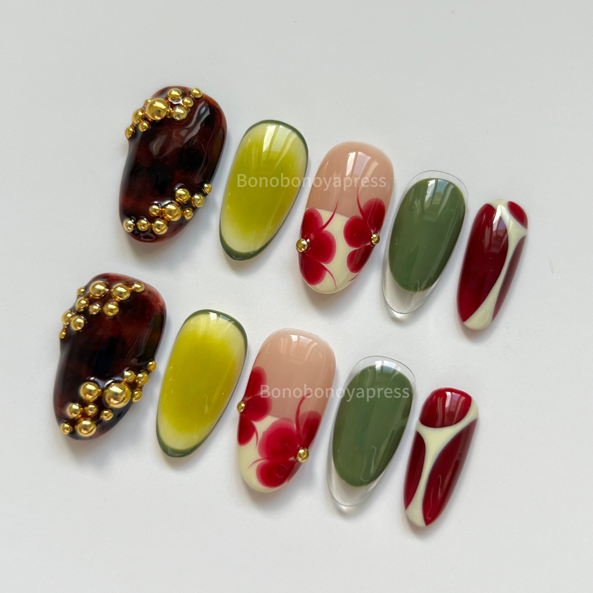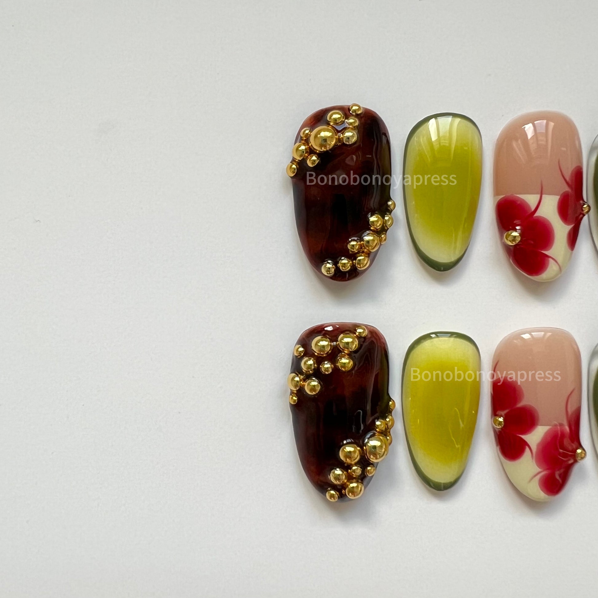 The perfect cosy fall set. Including tortie nails with gold charm accents, green auras and blooming gel flowers.