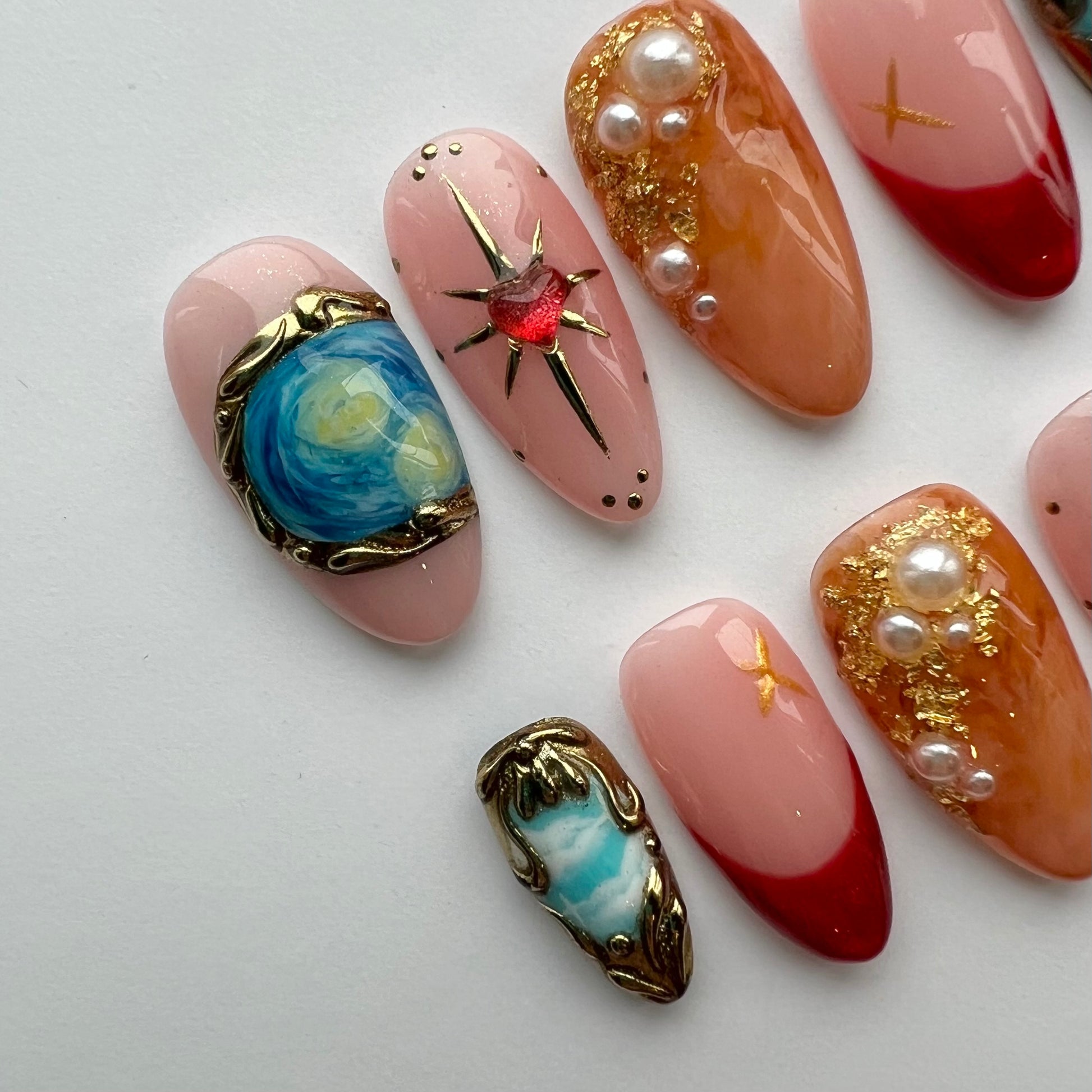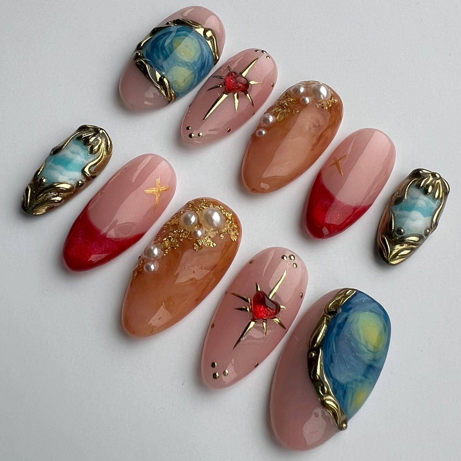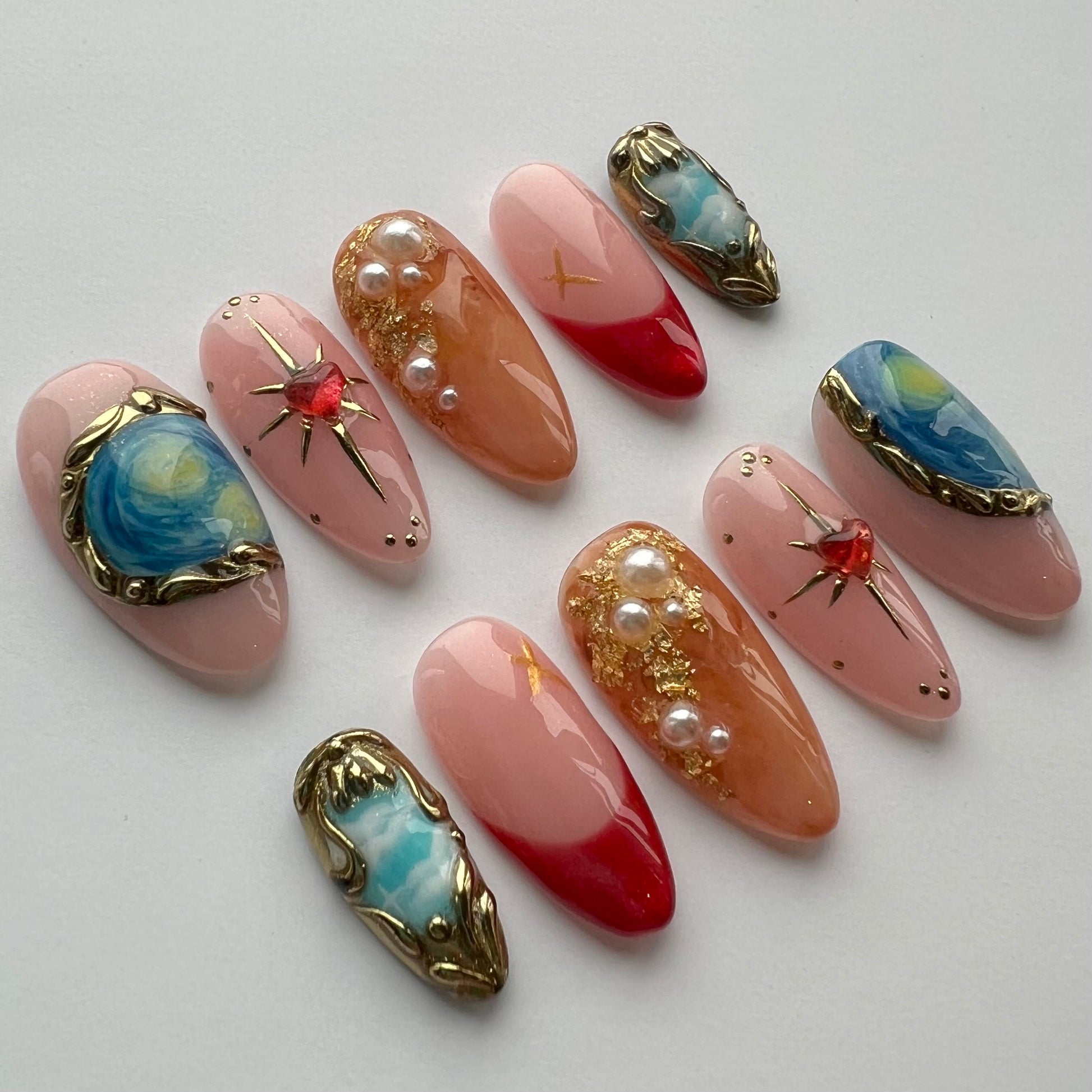 Inspired by V's Winter Ahead song. Including Van Gogh details, gold chrome, pearls and gold flakes, red cat eye french tips and a hidden NFC Tag which is linked to V's Winter Ahead song via Spotify when scanned.
