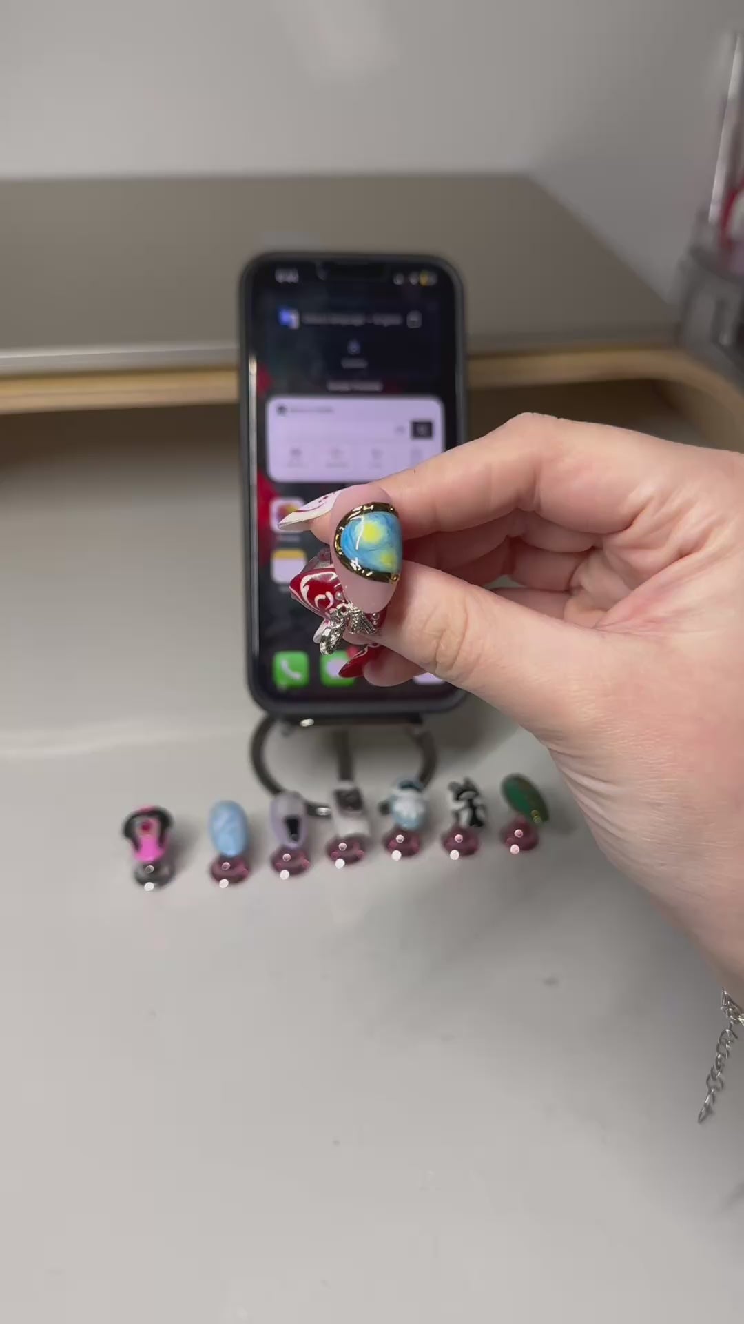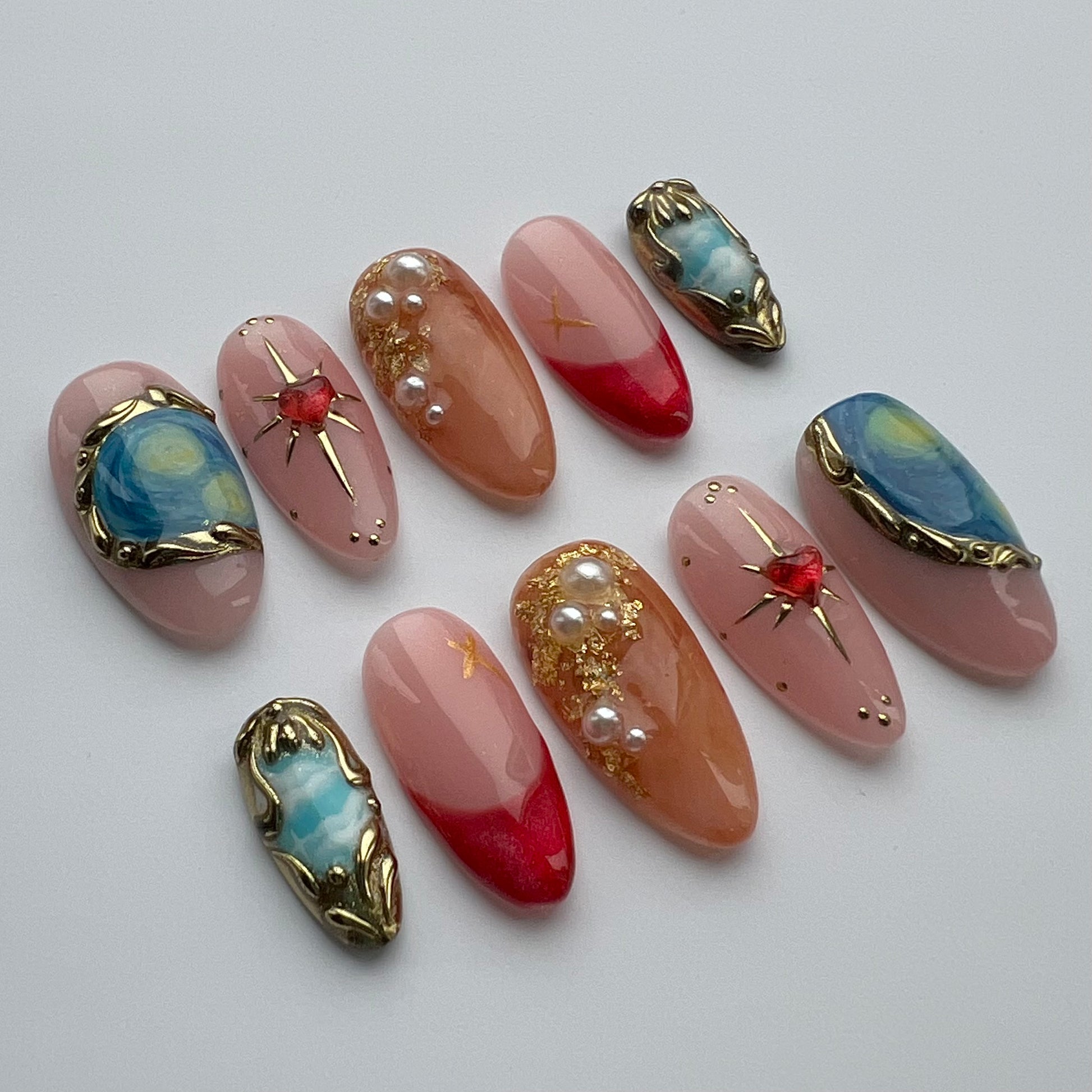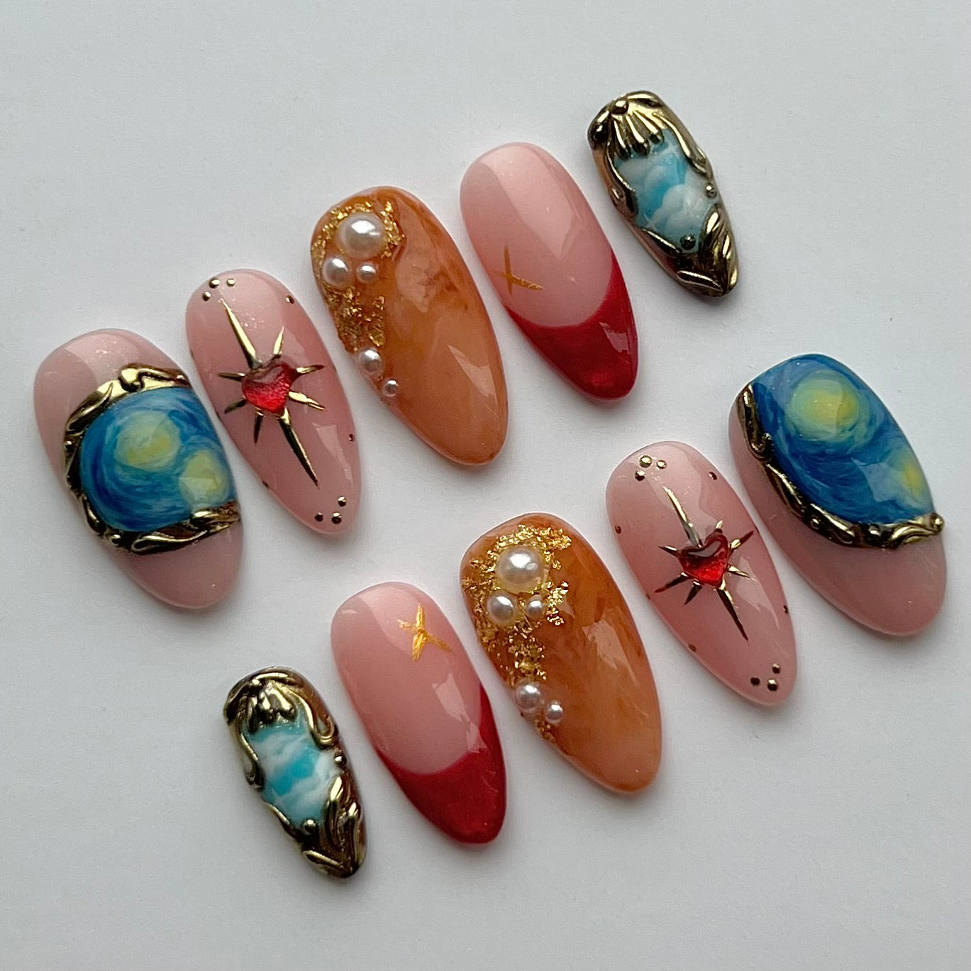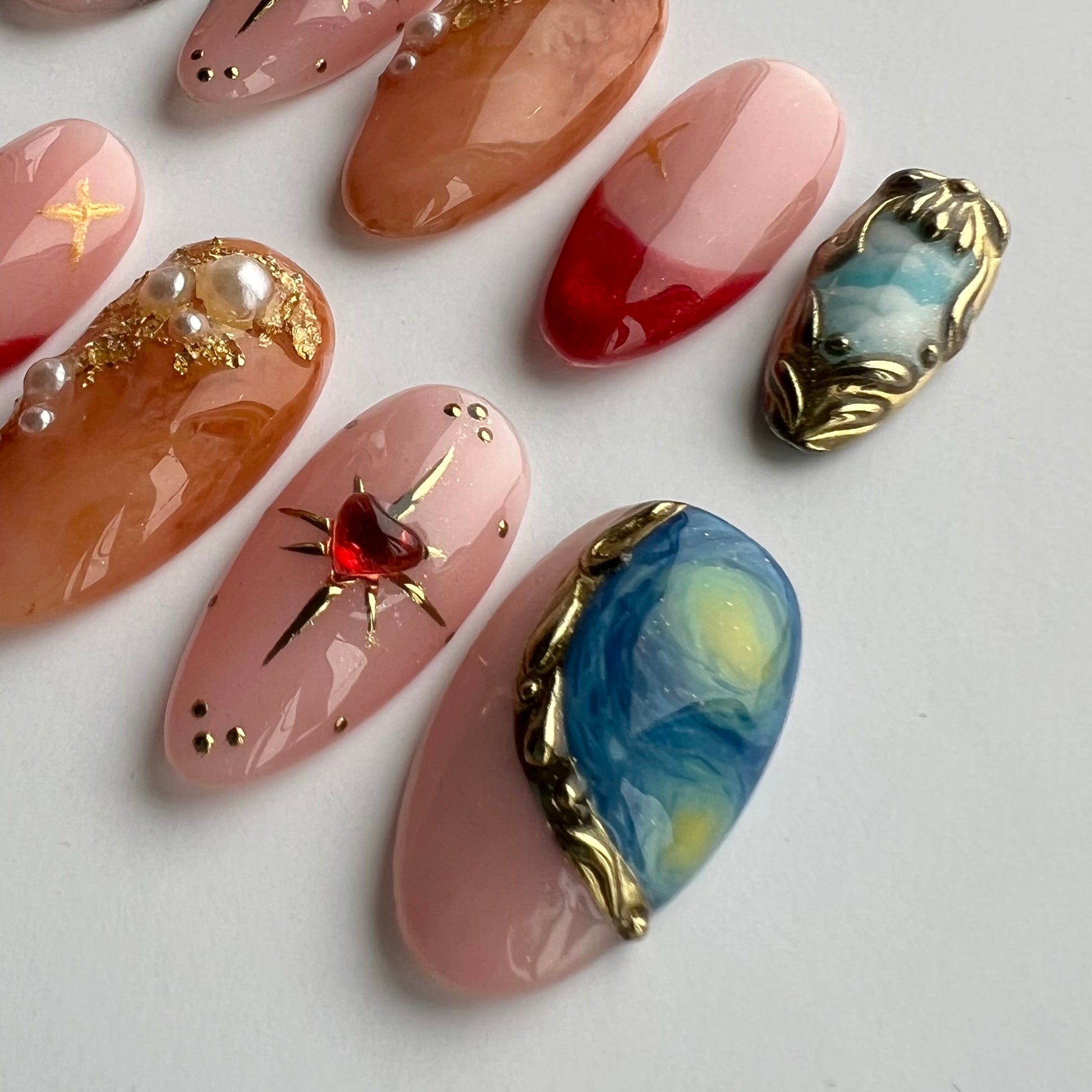 Inspired by V's Winter Ahead song. Including Van Gogh details, gold chrome, pearls and gold flakes, red cat eye french tips and a hidden NFC Tag which is linked to V's Winter Ahead song via Spotify when scanned.