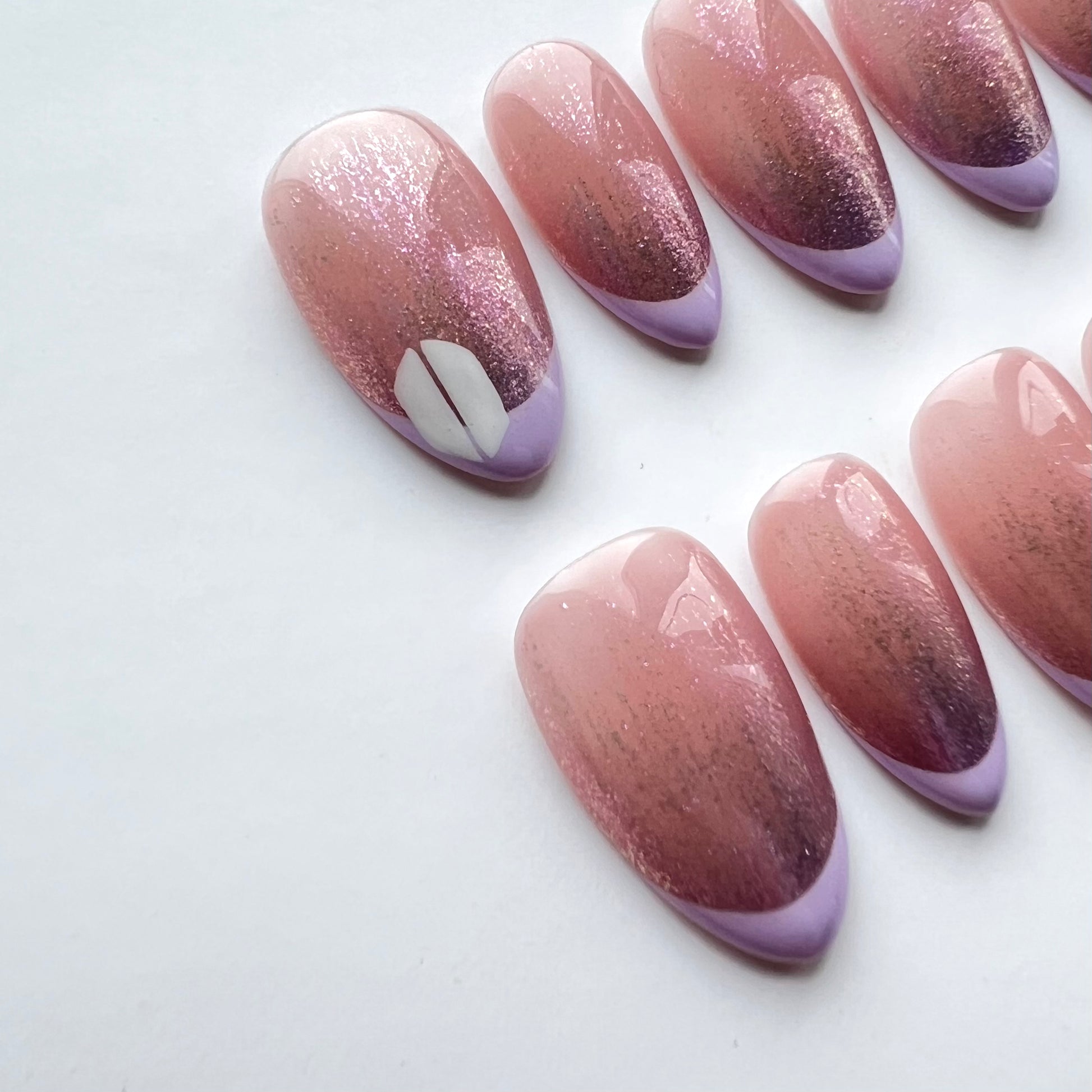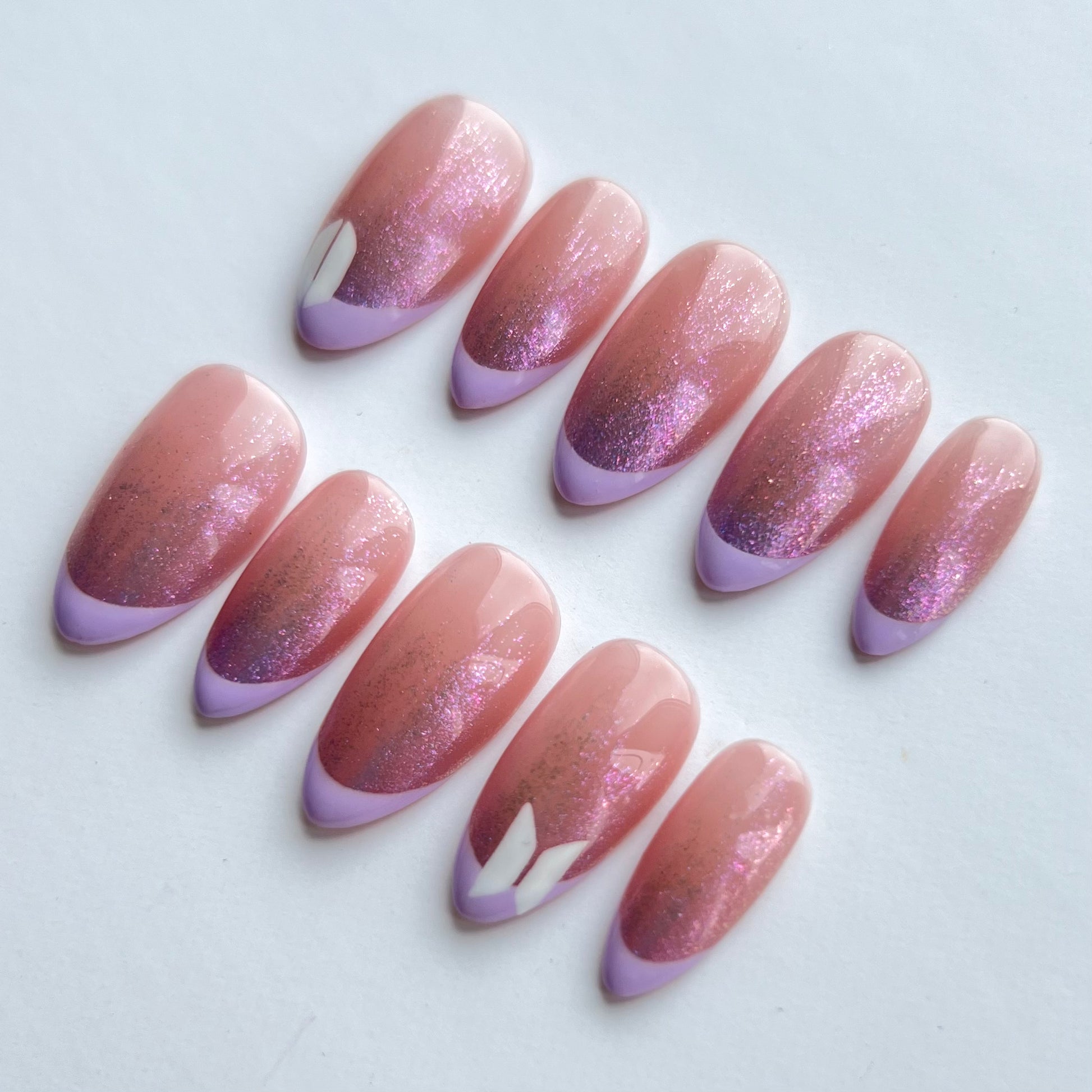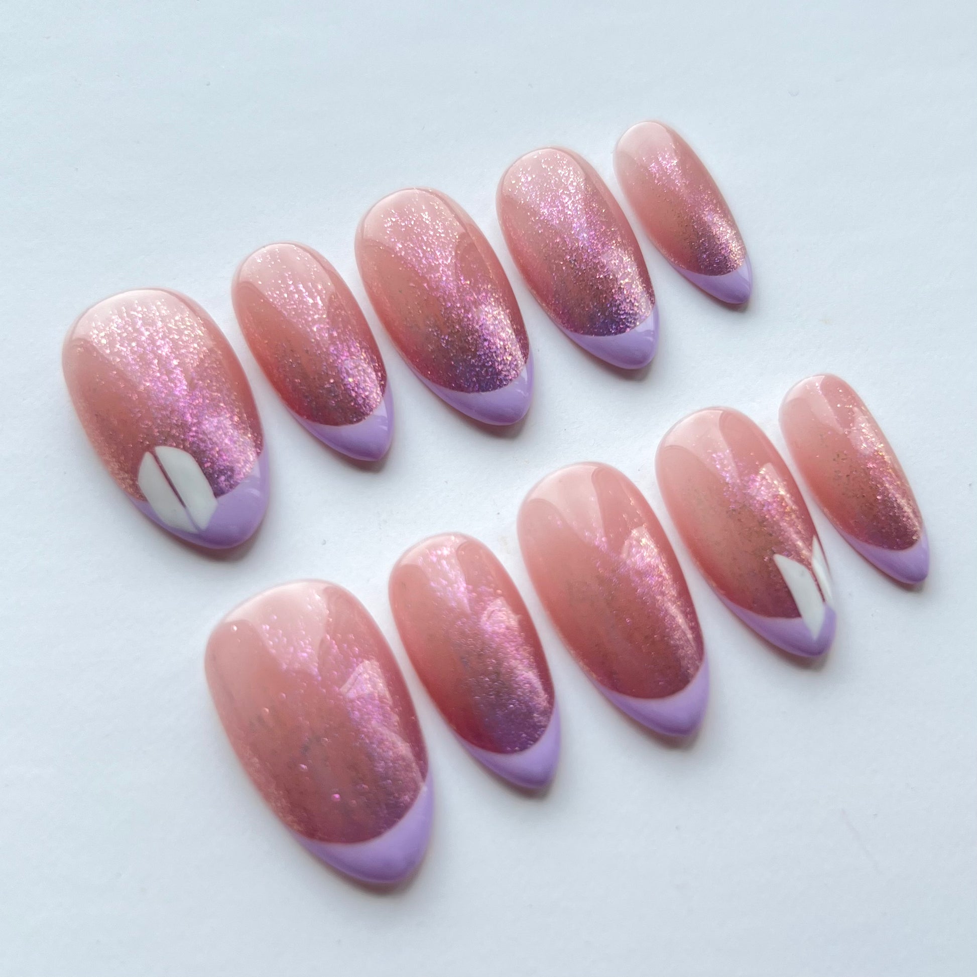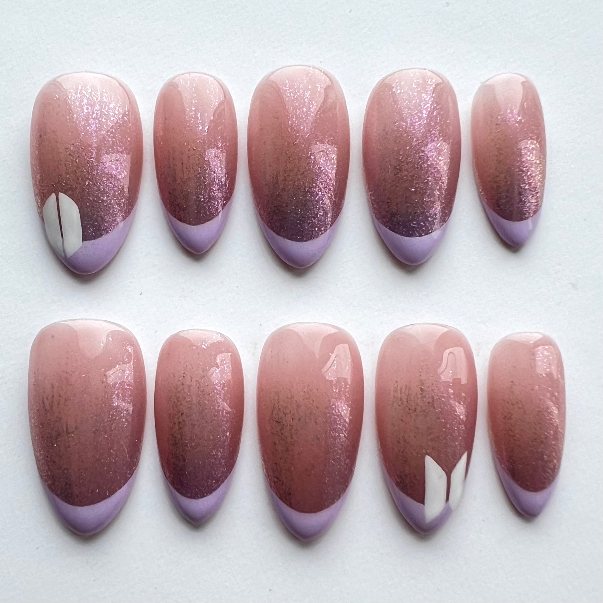 The perfect subtle BTS nails. Including ombre glitter, light purple french tips and hand painted details.