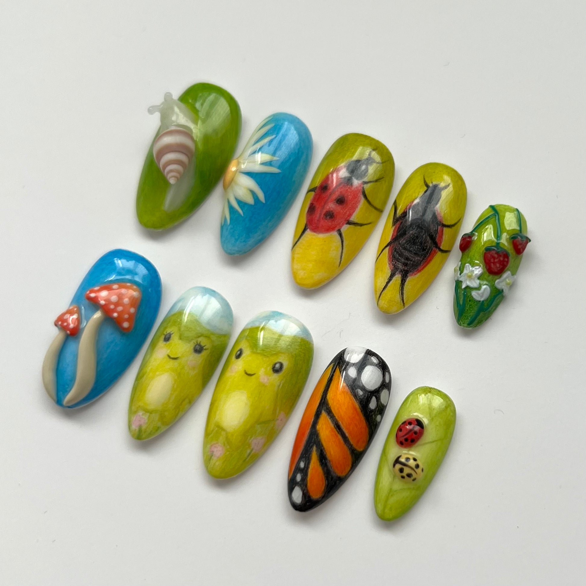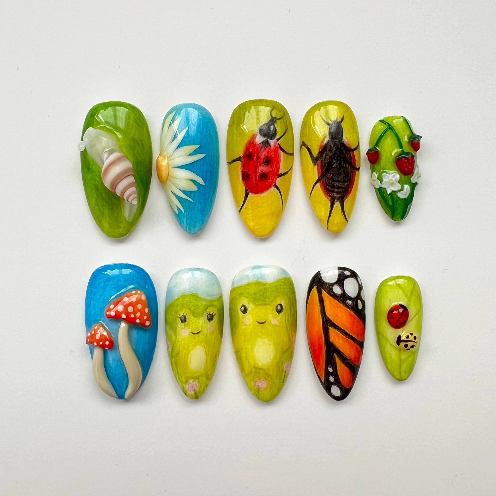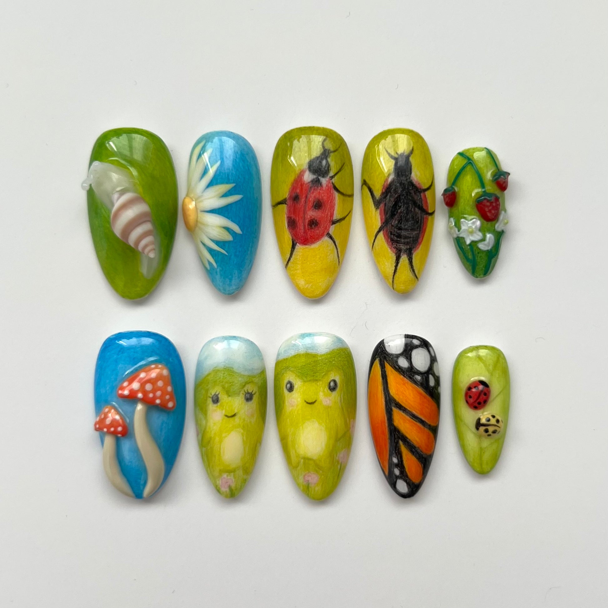 A set that gives cottagecore vibes. Details include coloured pencil backgrounds, sculpted 3D elements, hand drawn frogs and dancing ladybirds. All of the coloured pencil aspects of this set are completely hand drawn by myself with pencils.