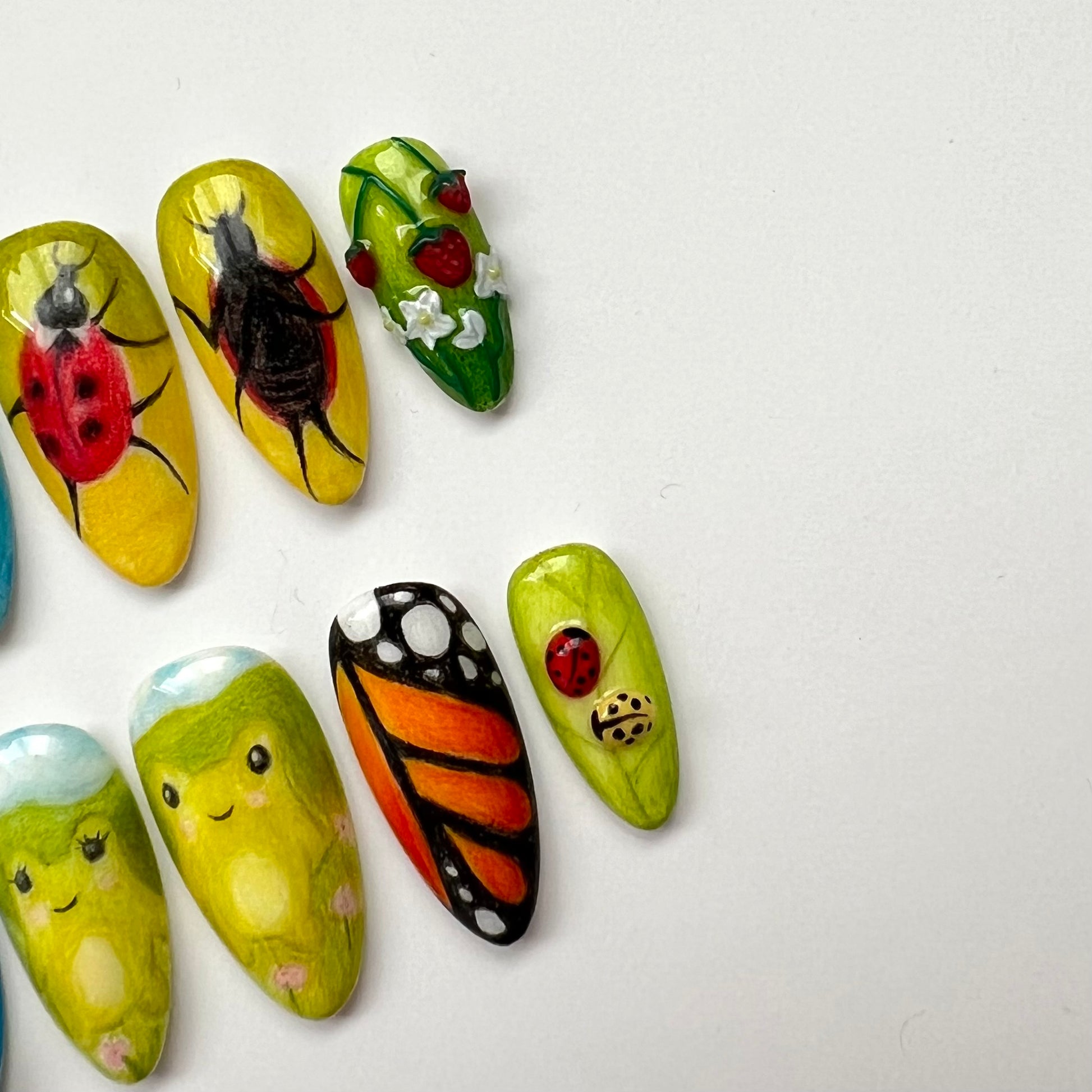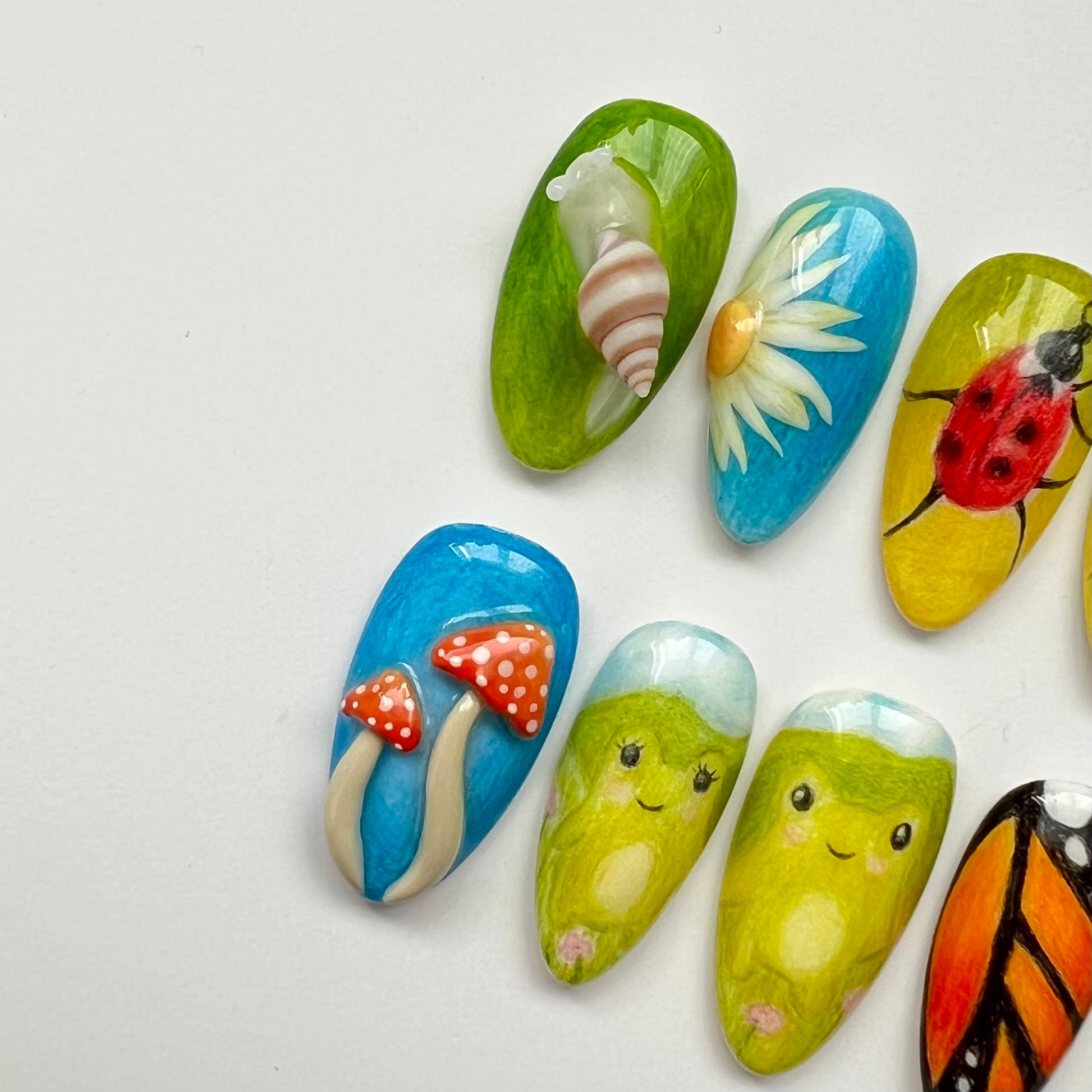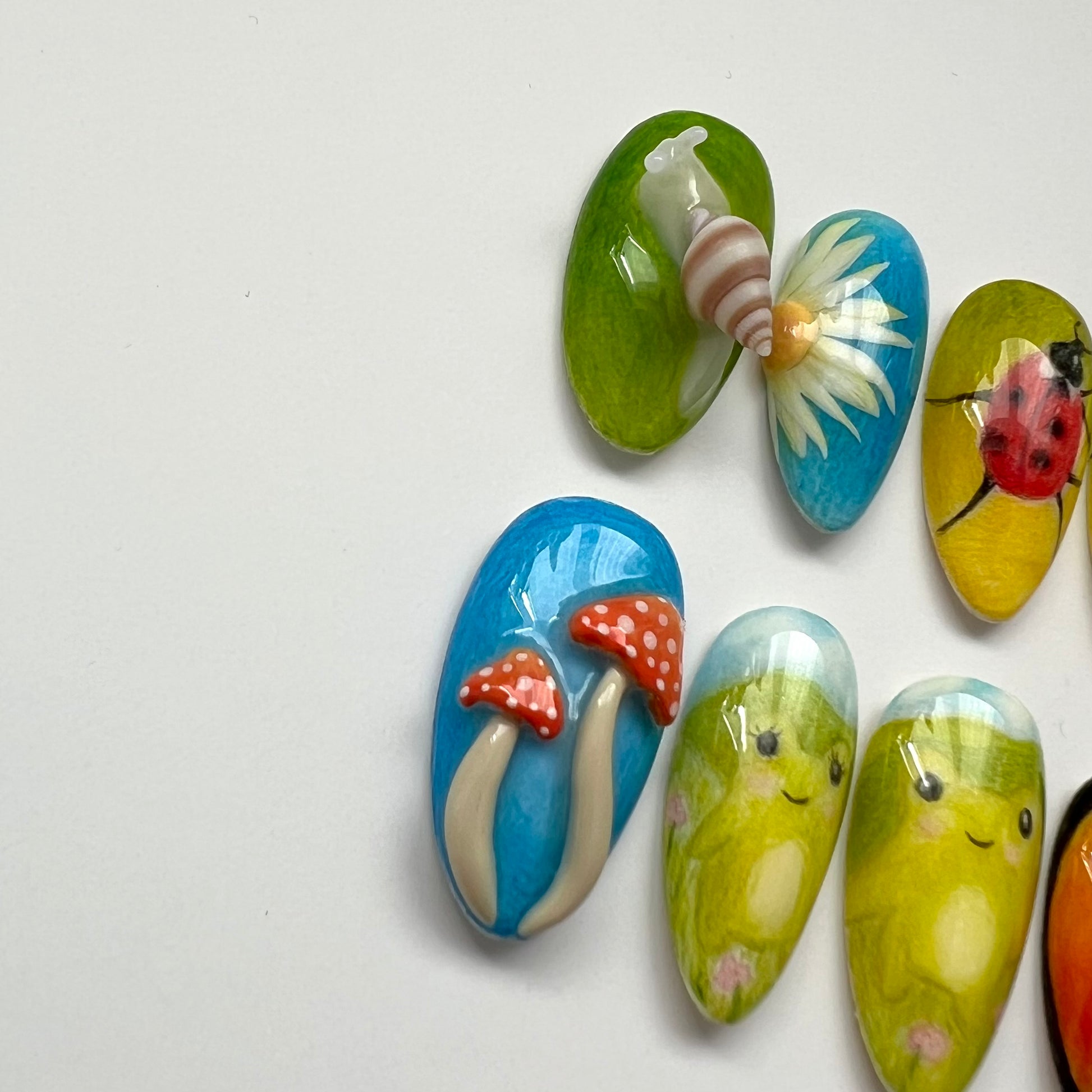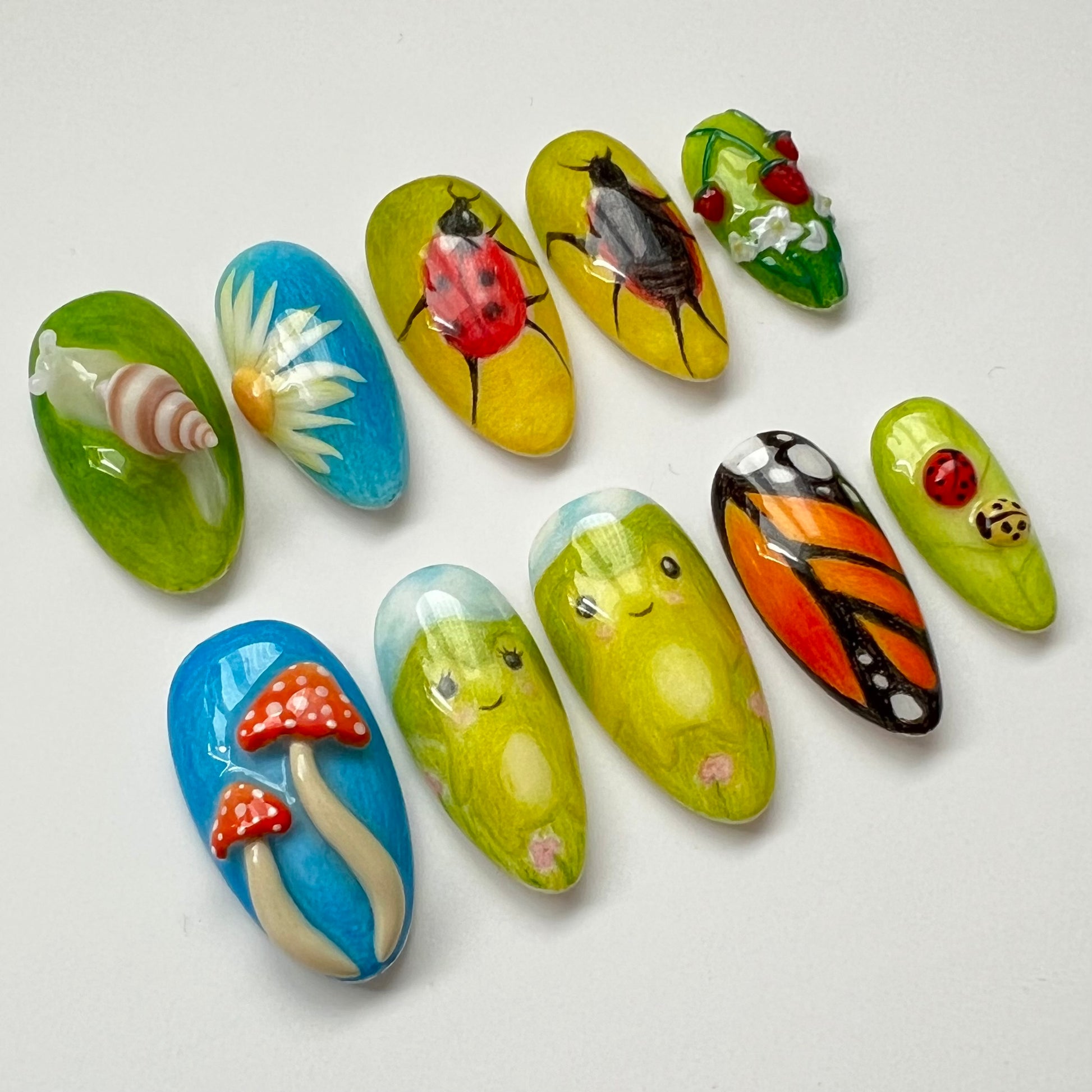 A set that gives cottagecore vibes. Details include coloured pencil backgrounds, sculpted 3D elements, hand drawn frogs and dancing ladybirds. All of the coloured pencil aspects of this set are completely hand drawn by myself with pencils.
