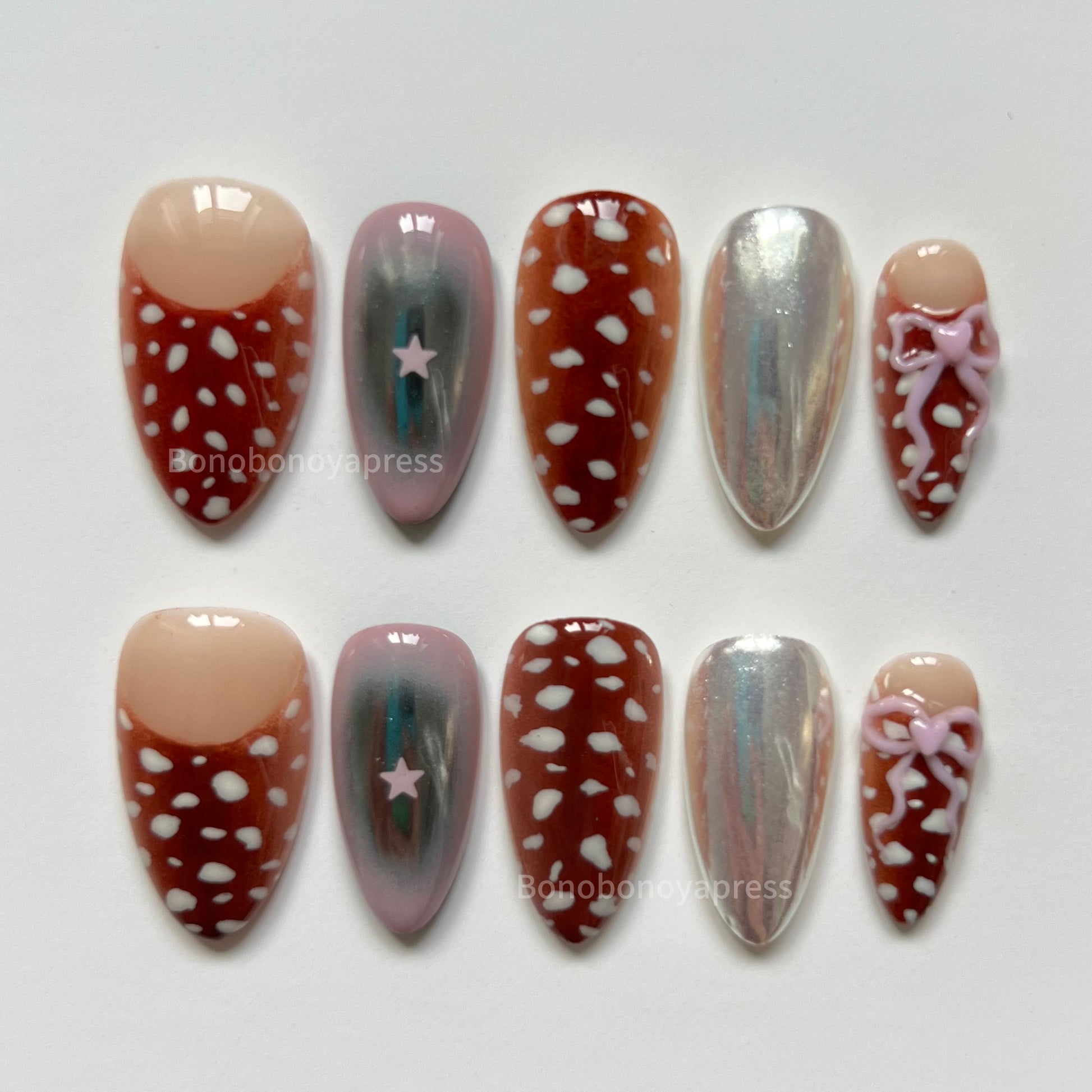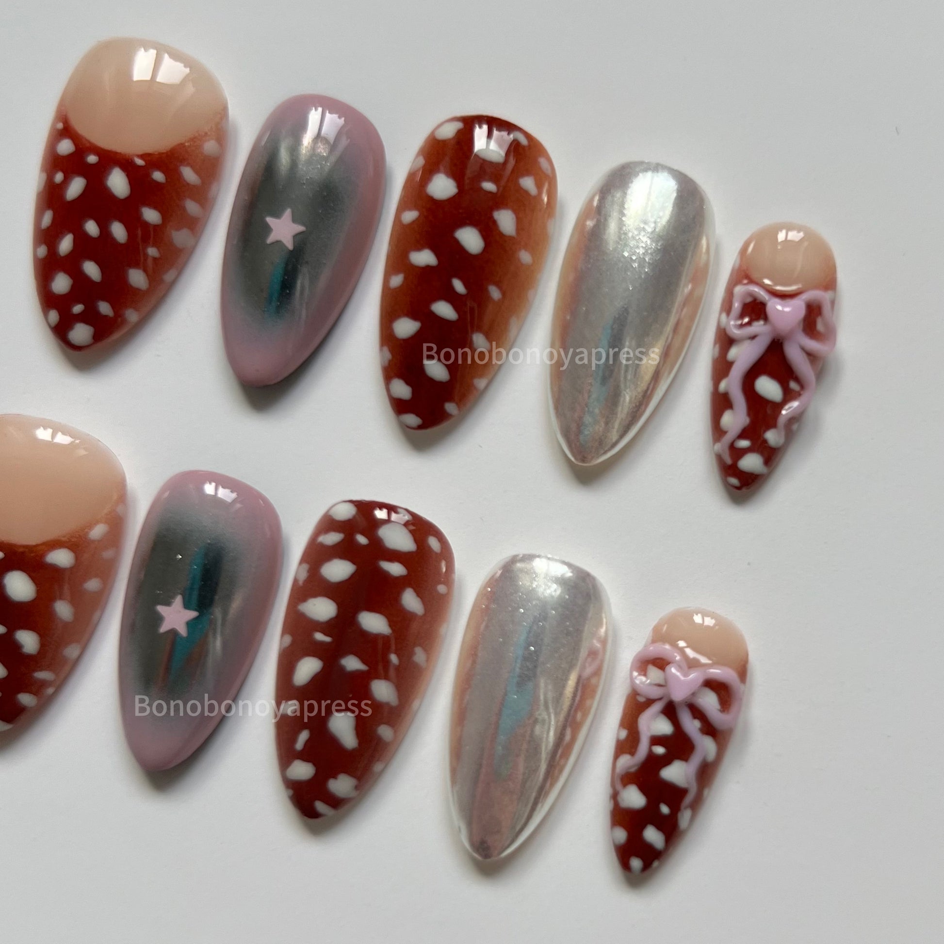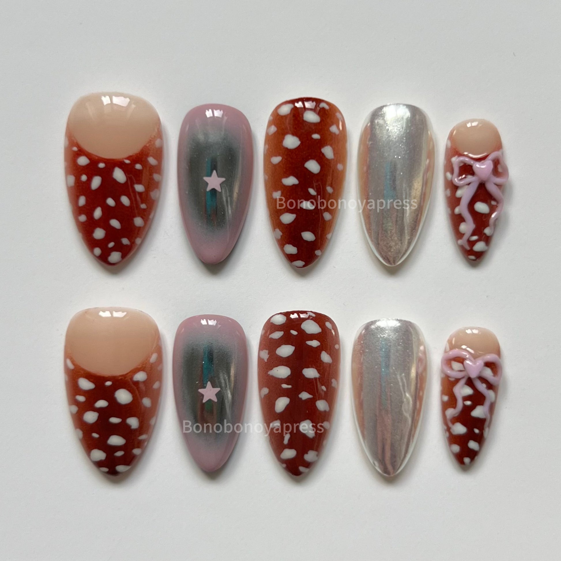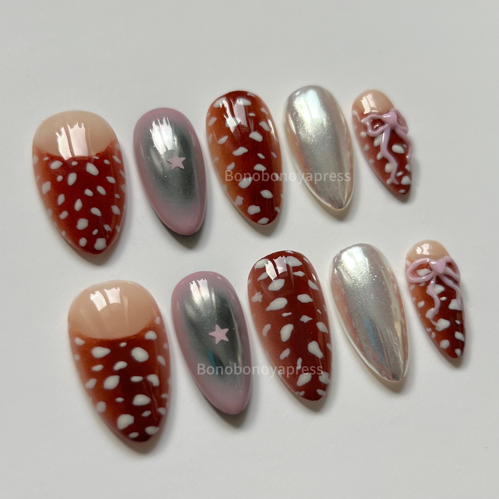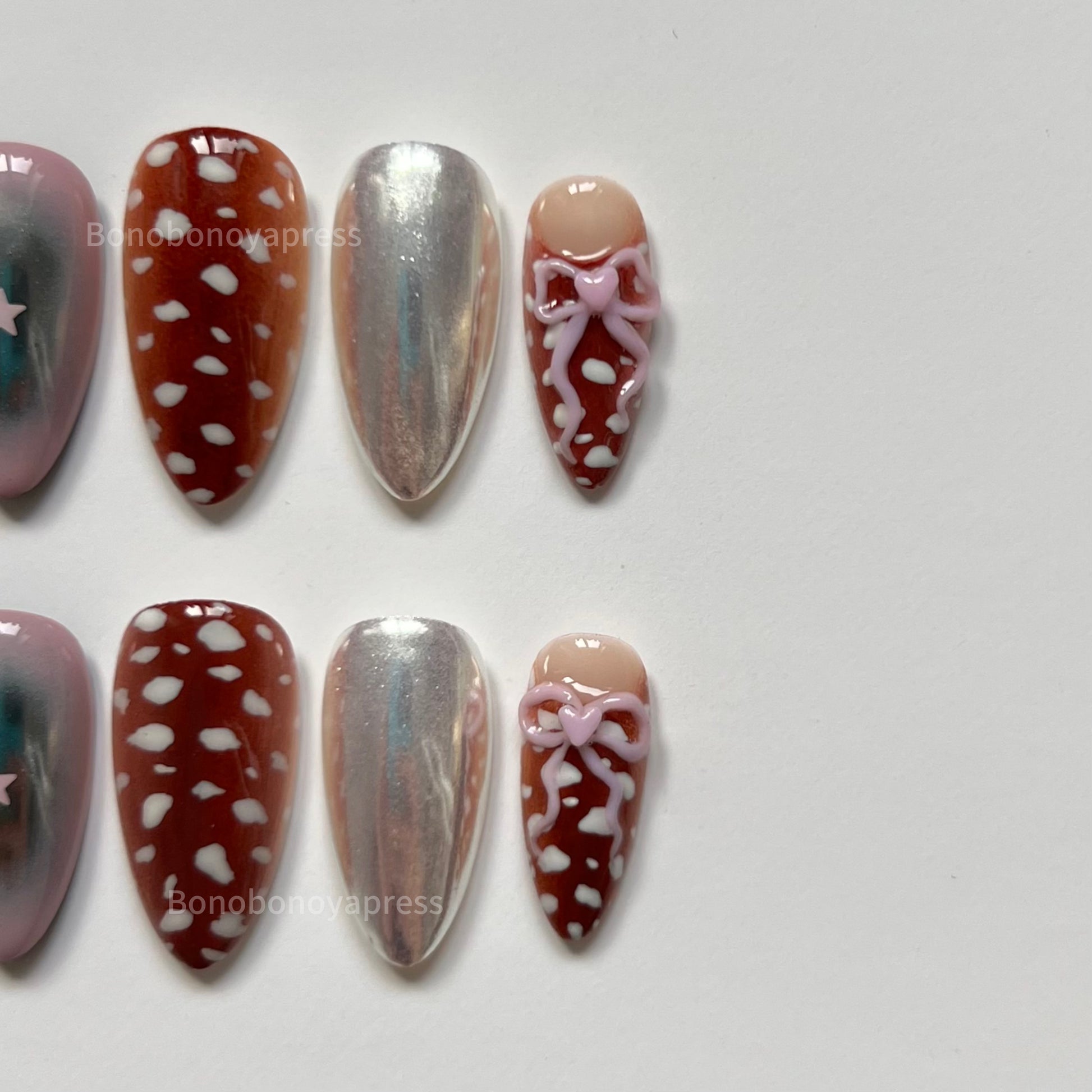 Details include Fawn prints, pearly chrome, pink hand sculpted bows and silver chrome with a pink ombre.