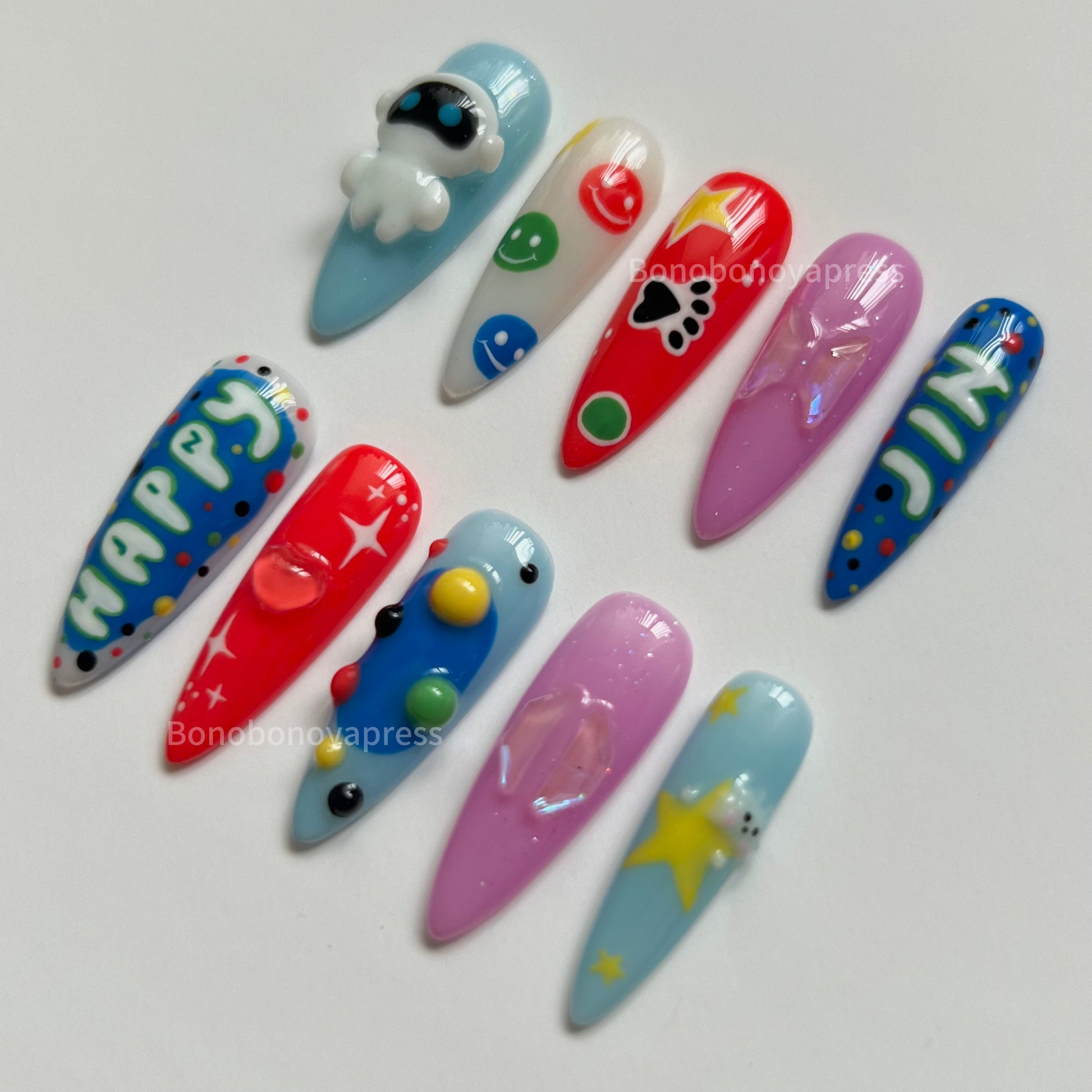 Inspired by Jin's Happy album. Including 3D BT21 character RJ and Wootteo, hand painted art and lettering, charms and a hidden NFC Tag which is linked to Jin's Happy album via Spotify when scanned.