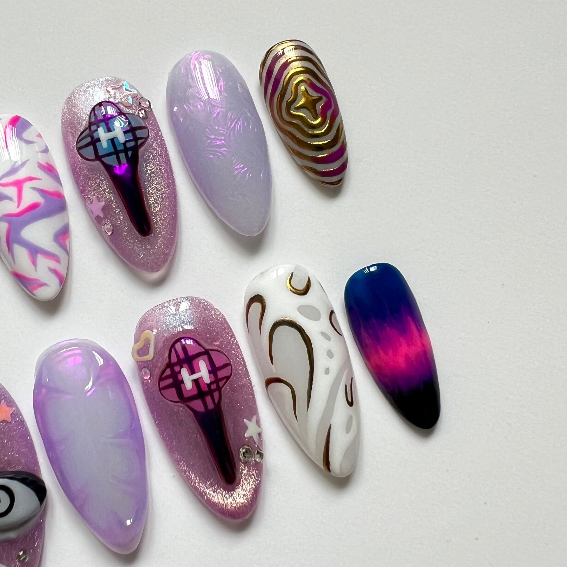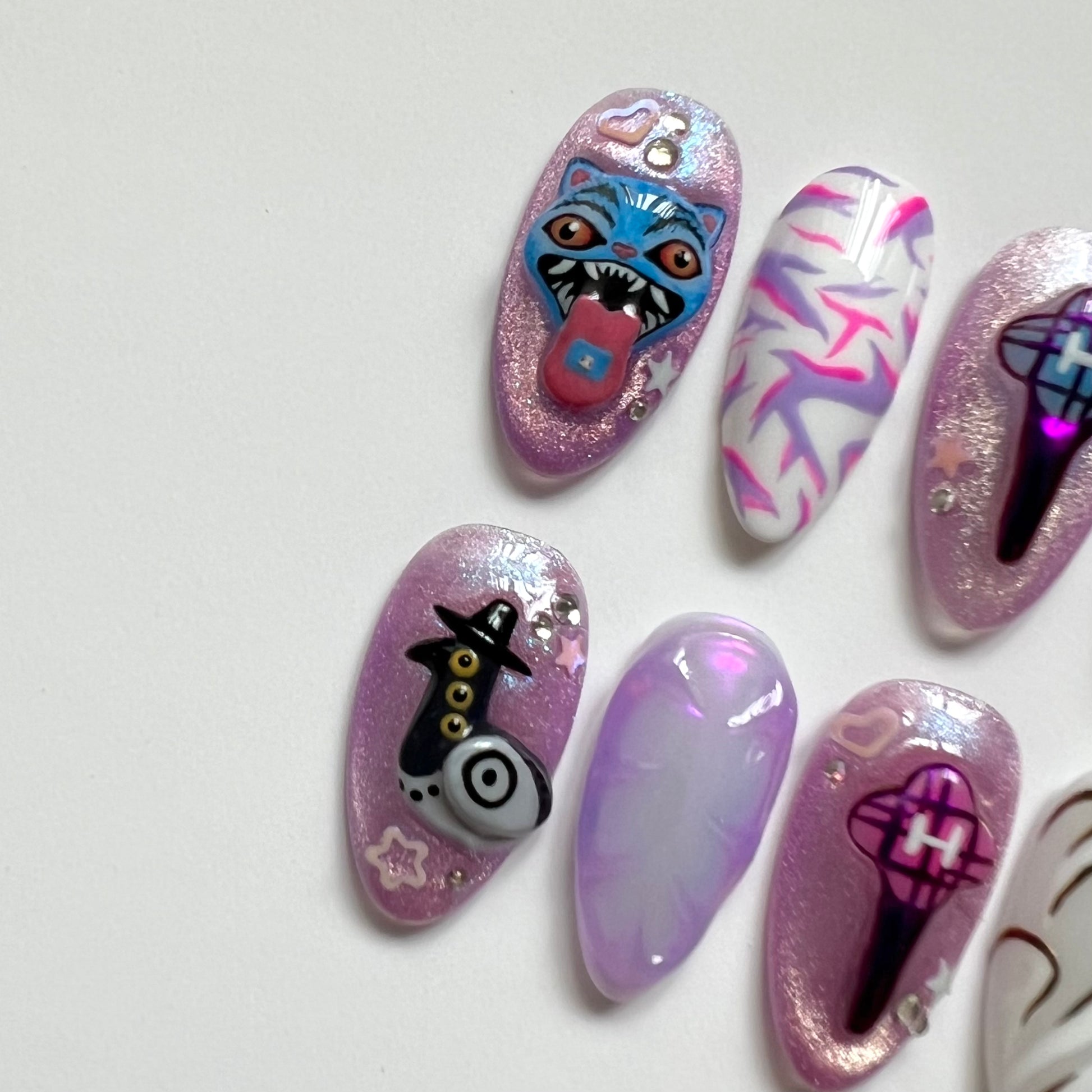 Inspired by the film KPop Demon Hunters. Details include a pink cat eye, purple and gold chrome, glow in the dark Huntrix light sticks, patterns and Gwi-ma, hand painted 3D Tiger and Magpie, jelly 3D and cute star charms.