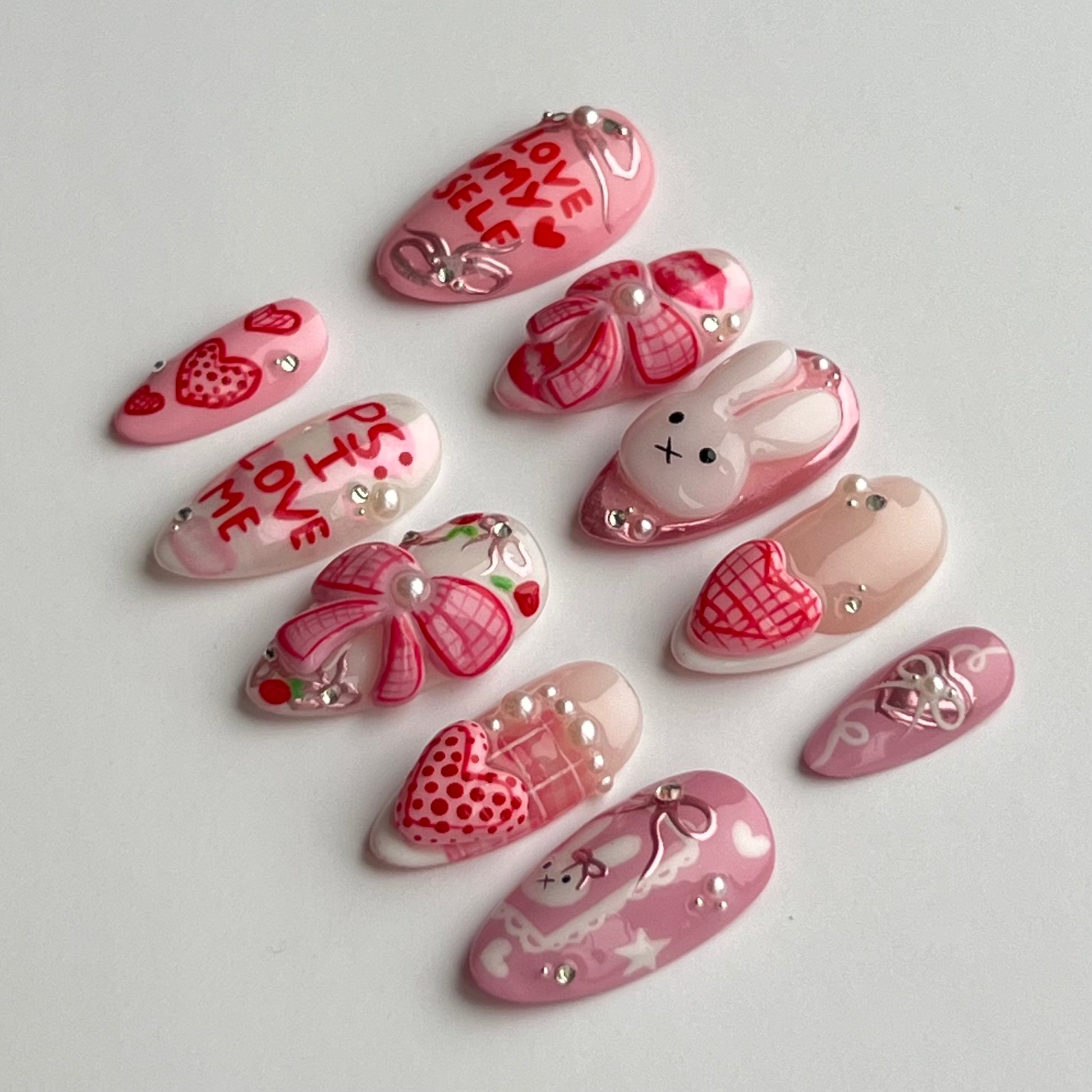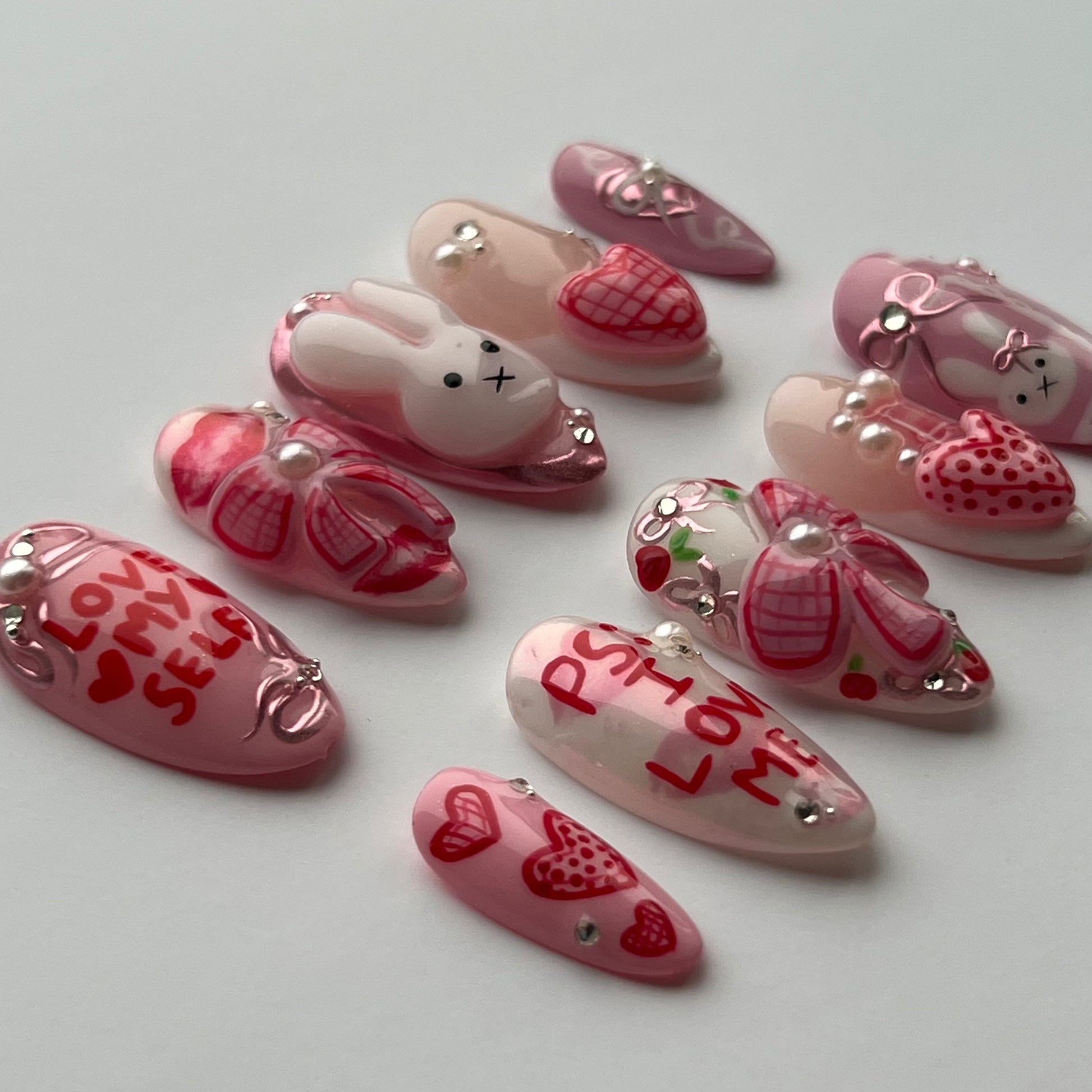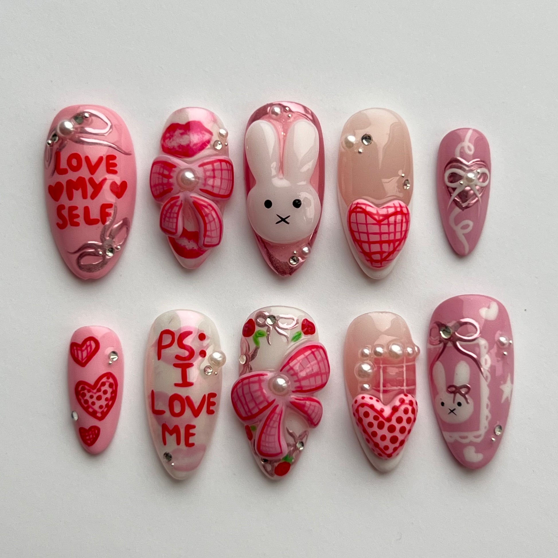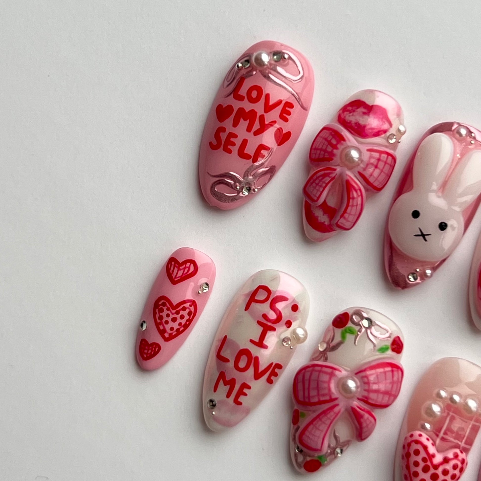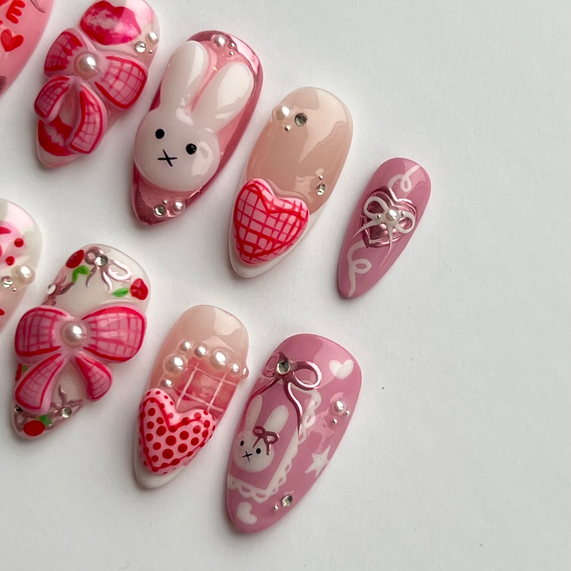 The cutest Miffy set! Including 3D sculped bows, hearts and Miffy, pink chromes, hand painted details and gems/pearls.