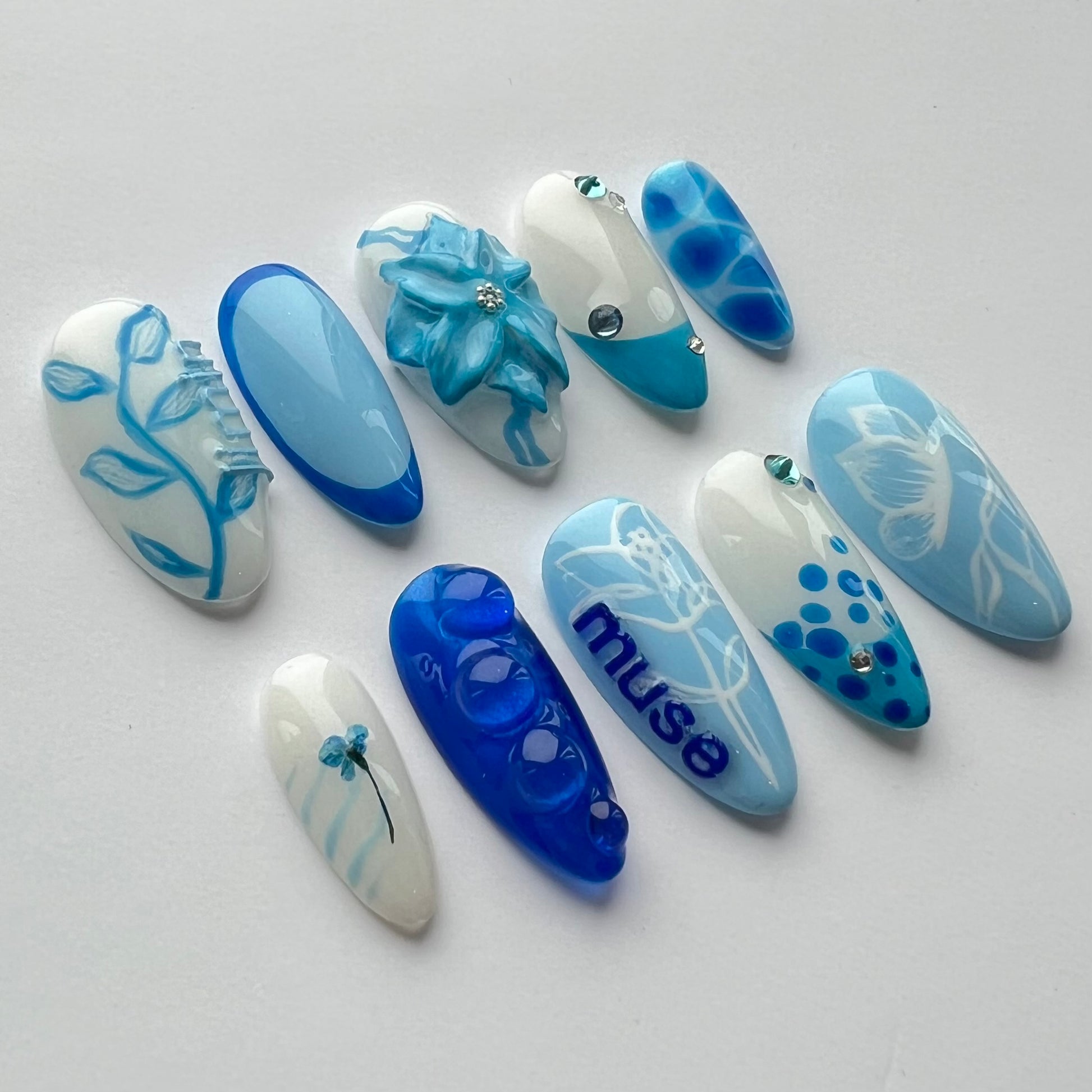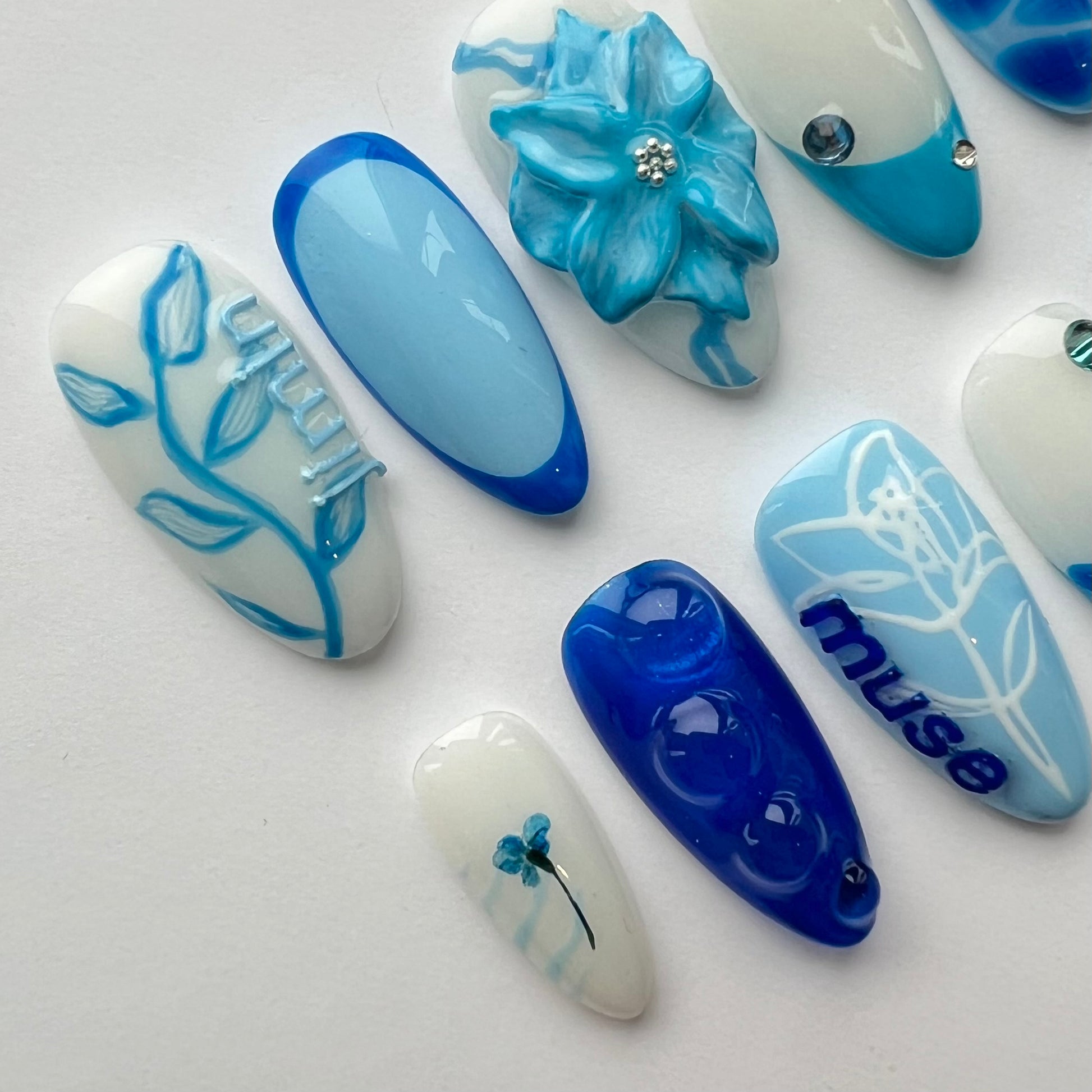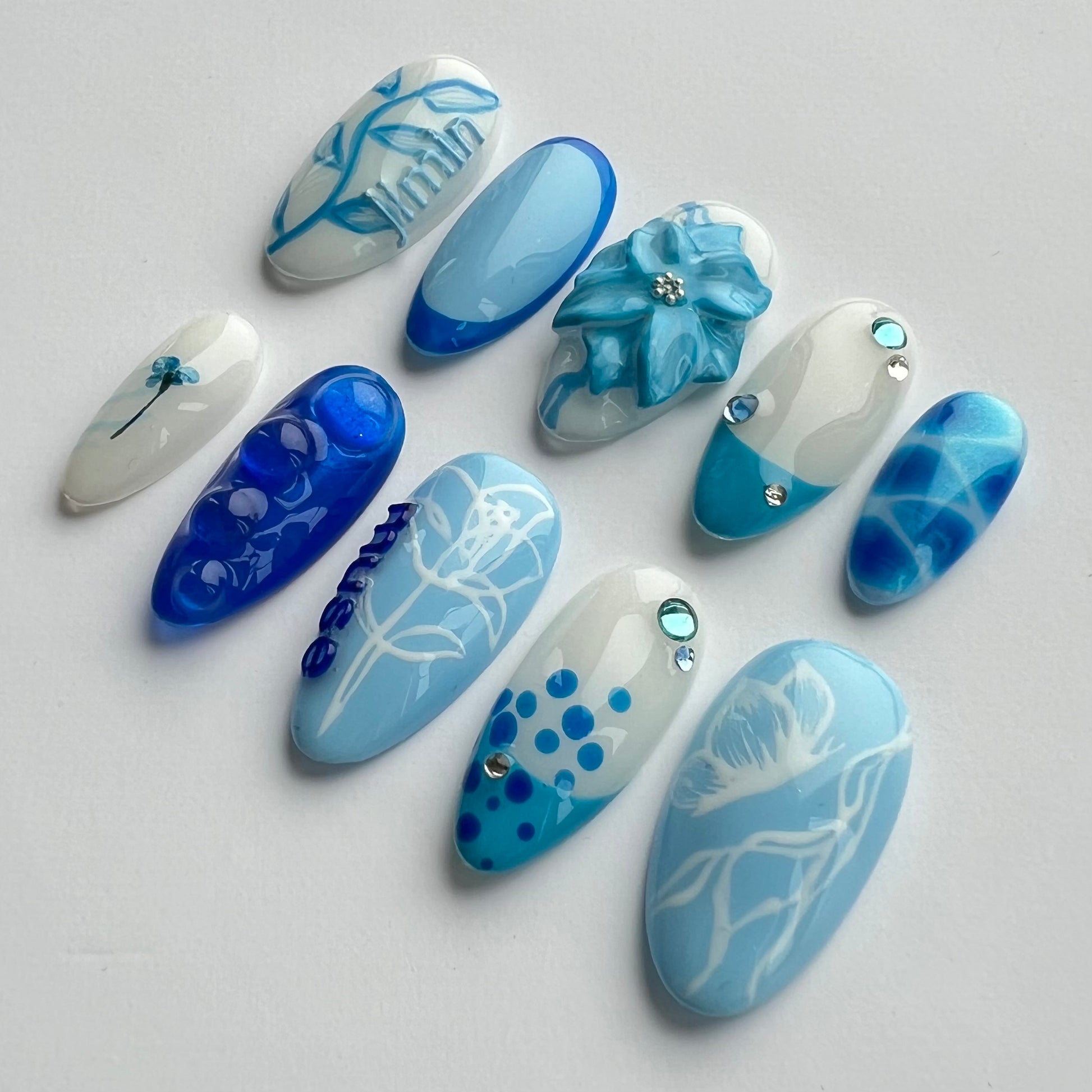 Inspired by Jimin's Muse album. Including a hand sculpted and painted 3D flower, hand painted art such as the flowers/leaves and butterfly, french tips, a real dried and encapsulated flower and a hidden NFC Tag which is linked to Jimin's Muse album via Spotify when scanned.
