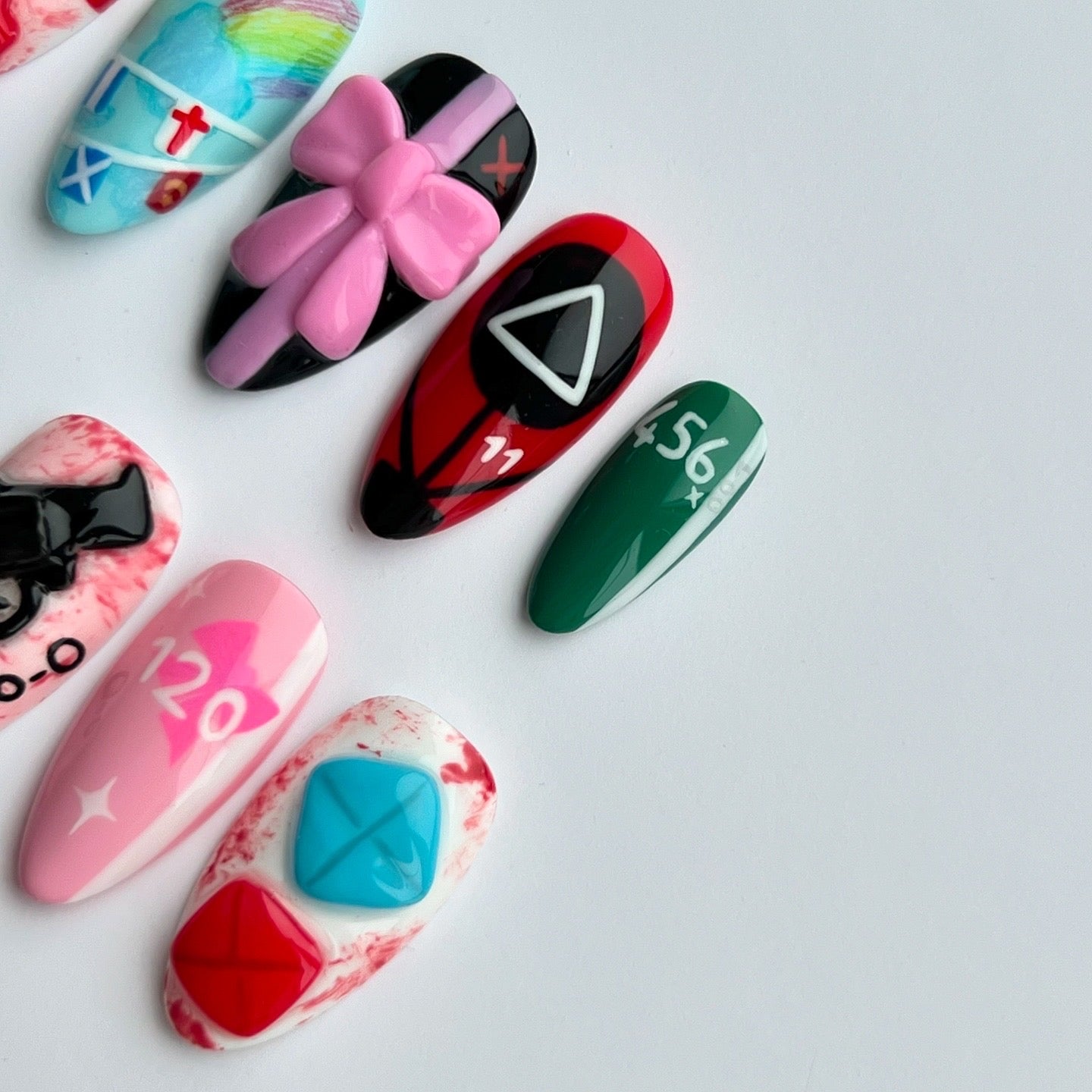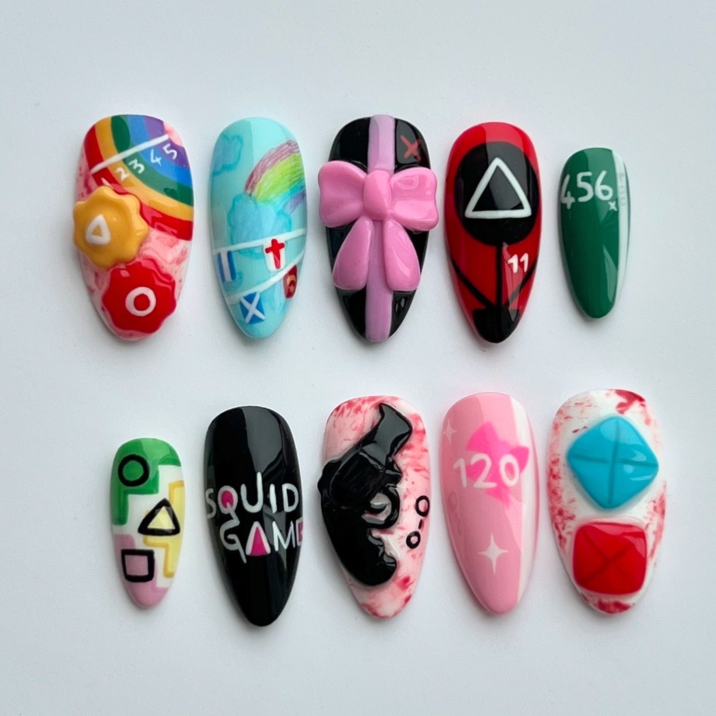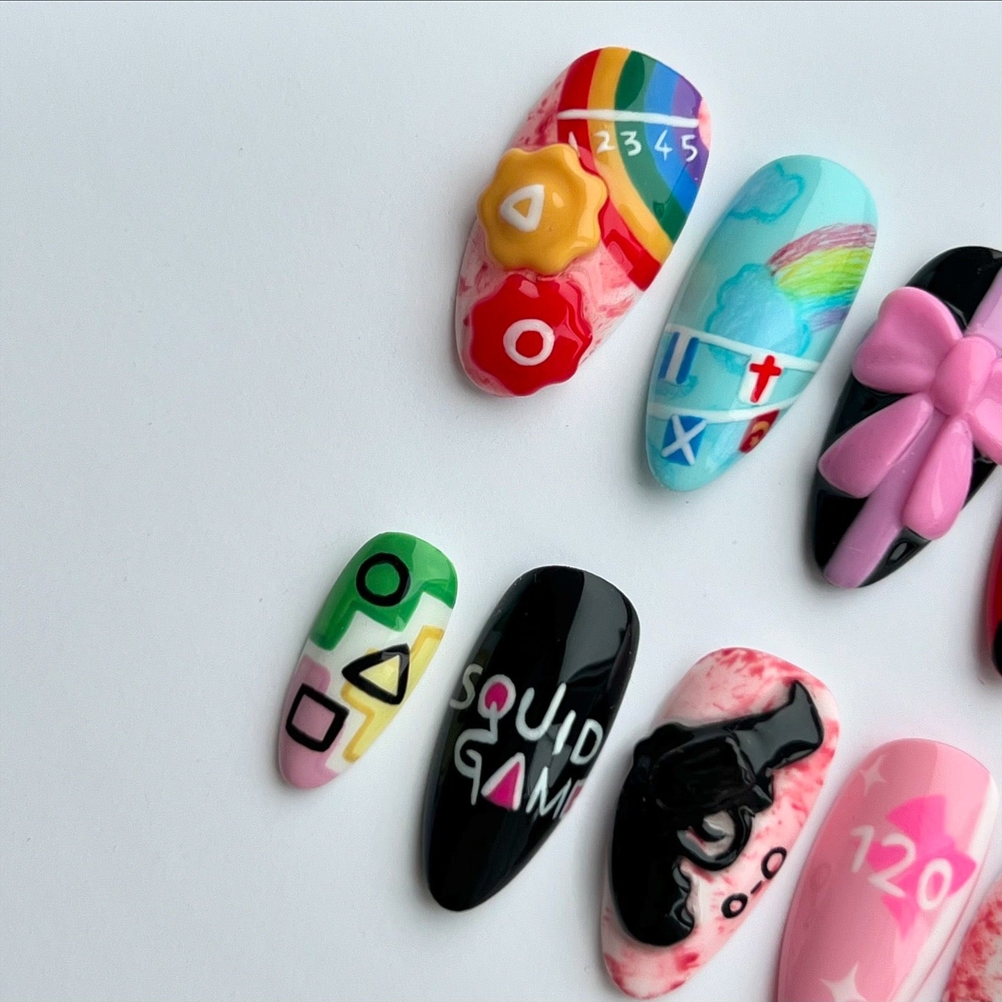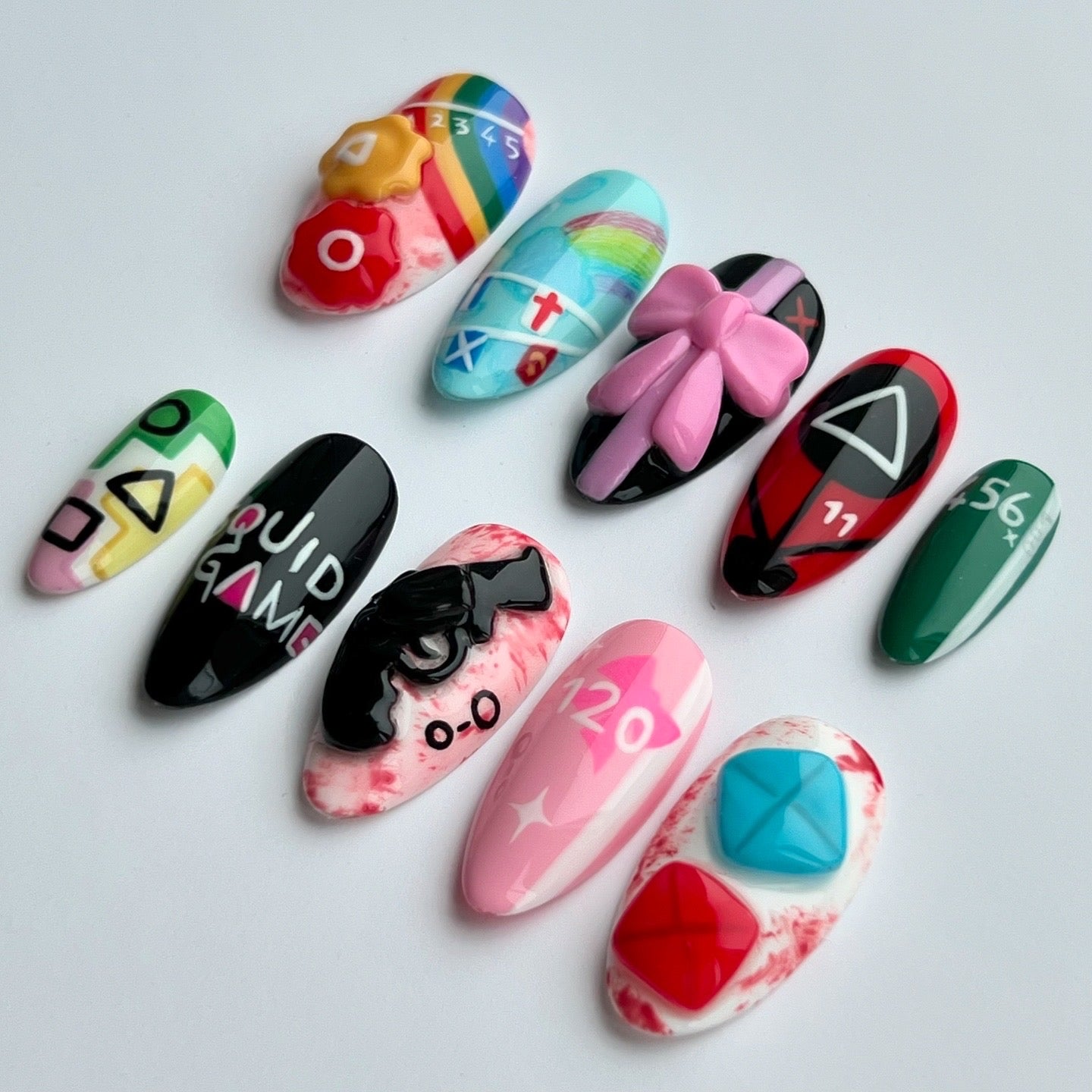 Inspired by the Squid Games series. Including hand painted details, hand sculpted 3D elements such as the gun and pink bow, hand drawn pencil details and hidden easter eggs.