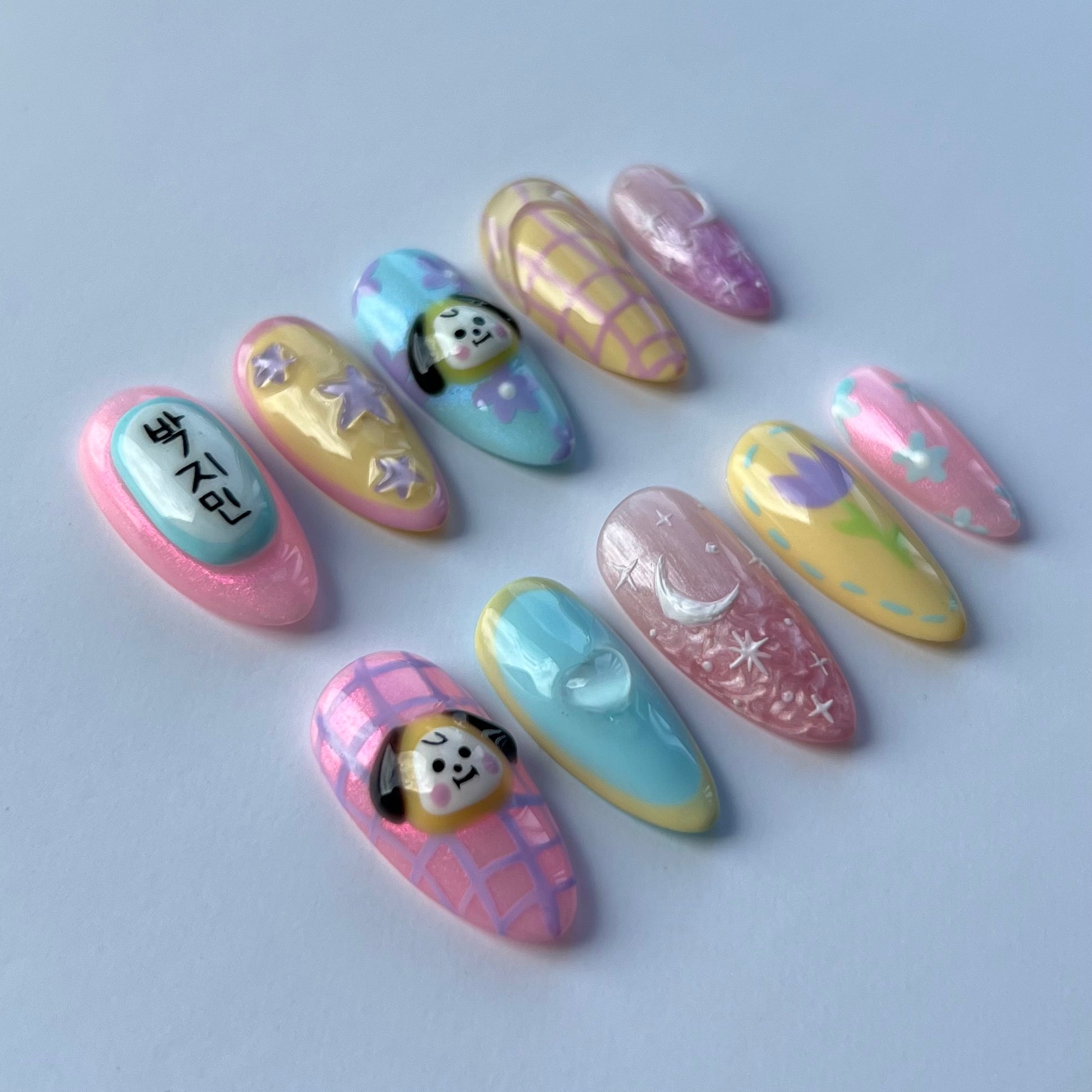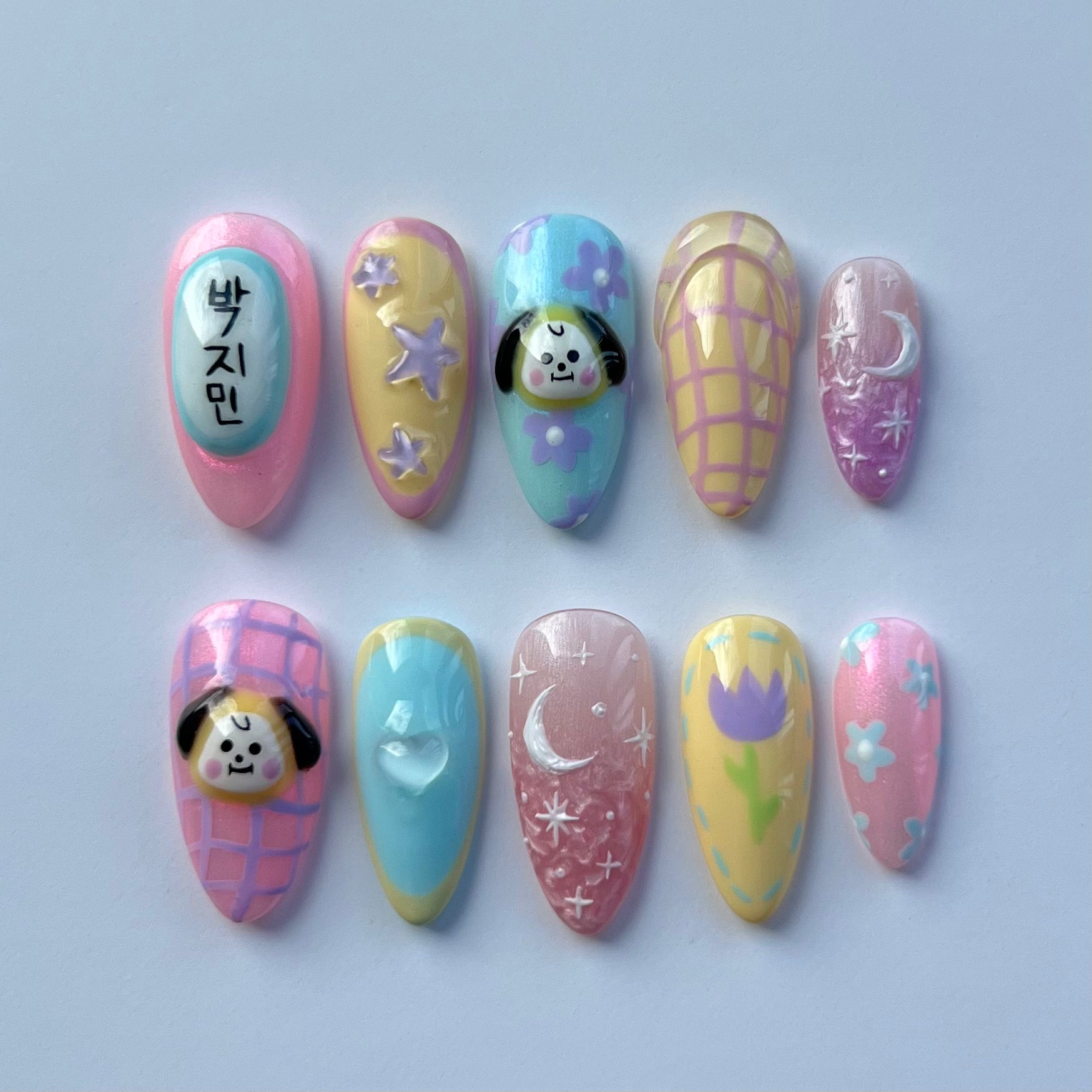 Including 3D BT21 character Chimmy, 3D texture gel moons and stars, hand painted lettering and flowers.