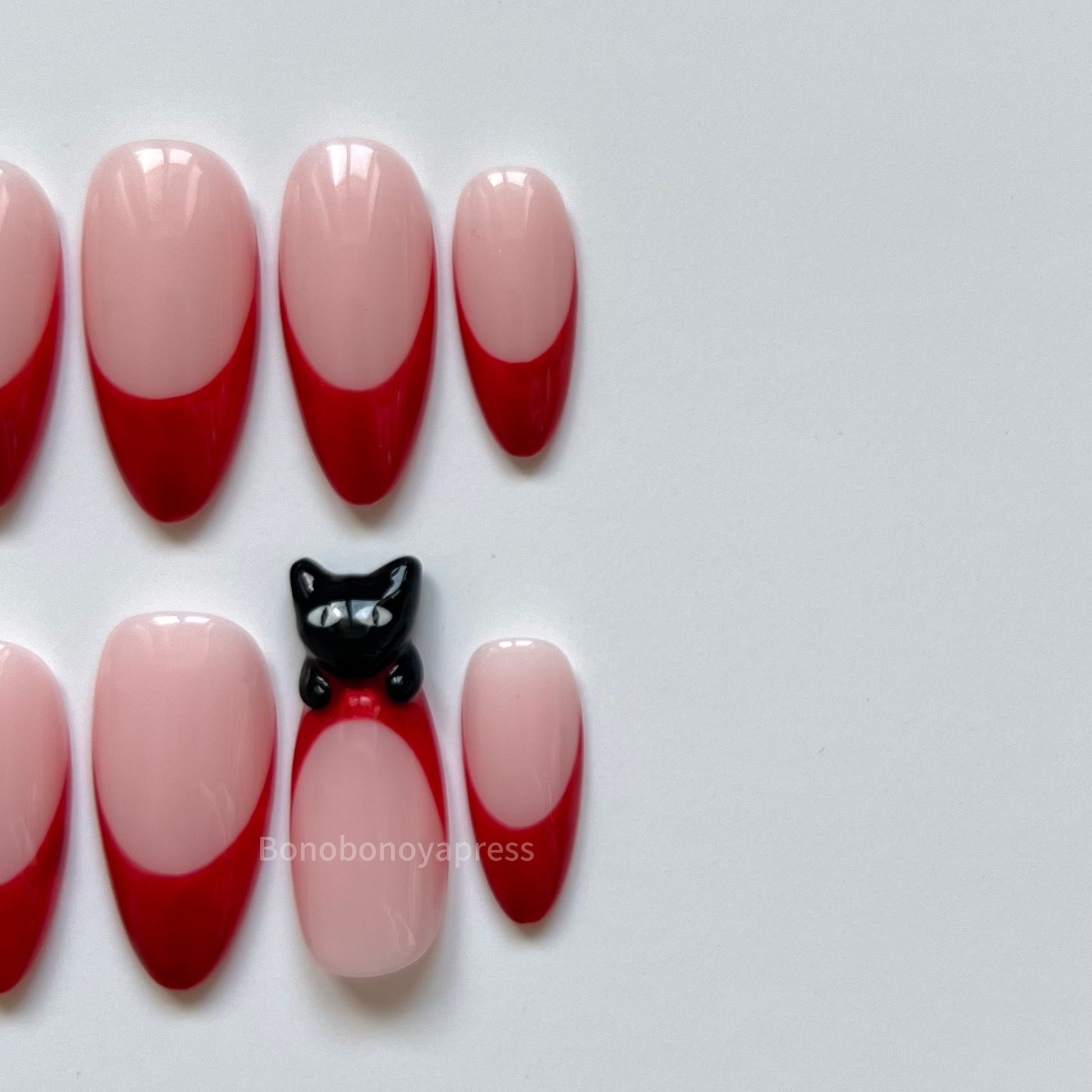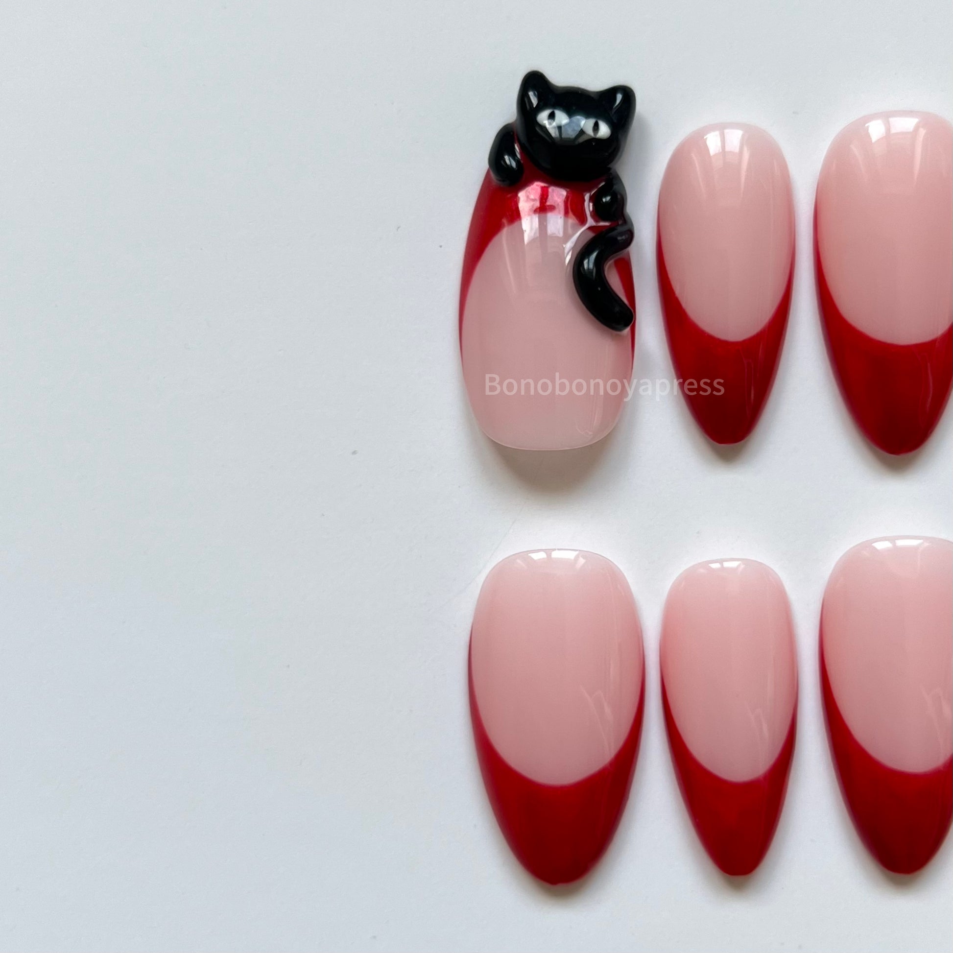 One for Cat lovers. Pearly red french tips and black cat pet nails.
