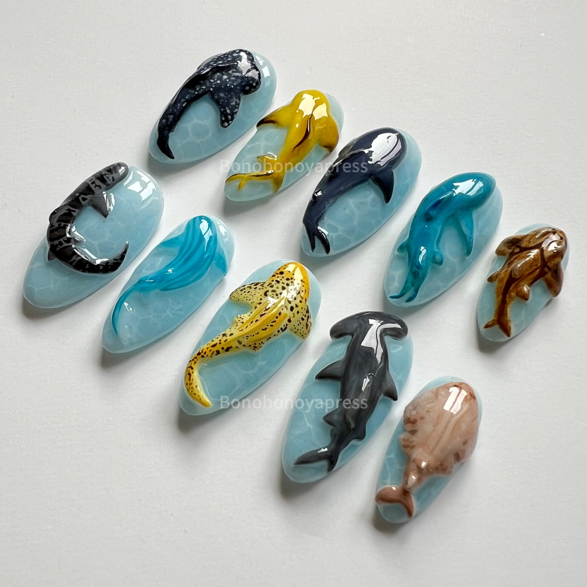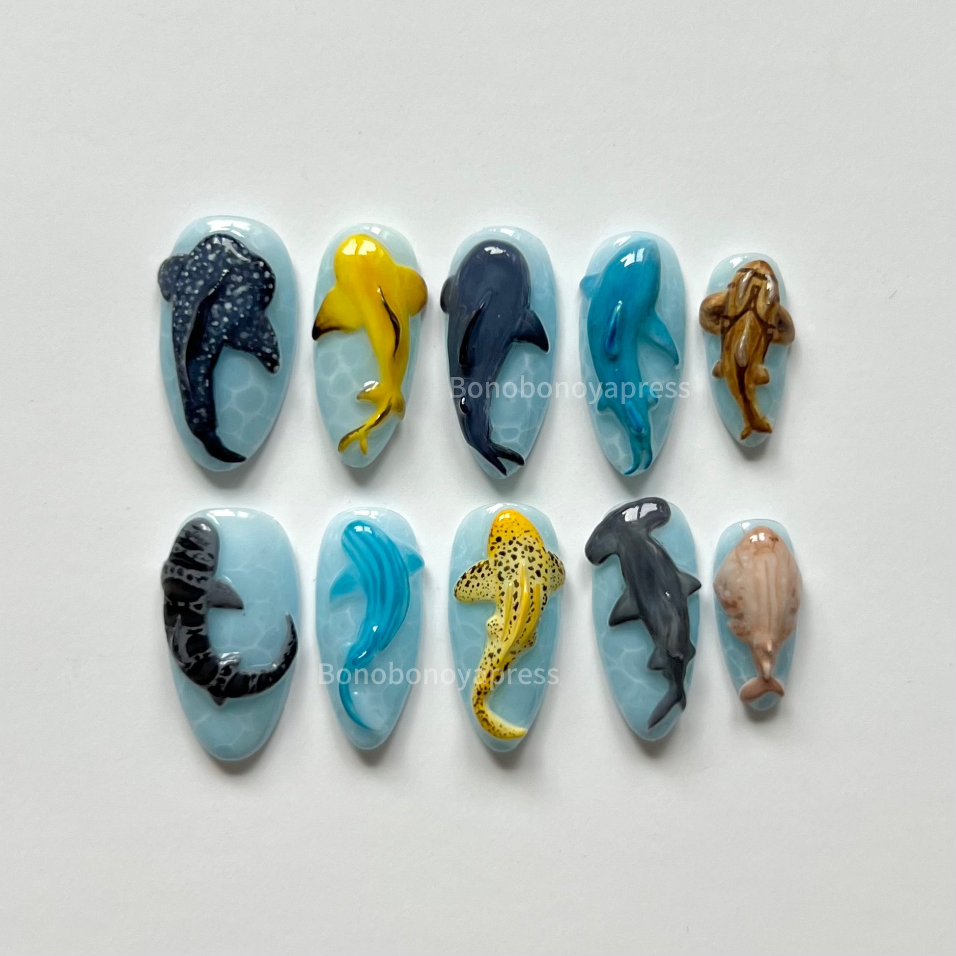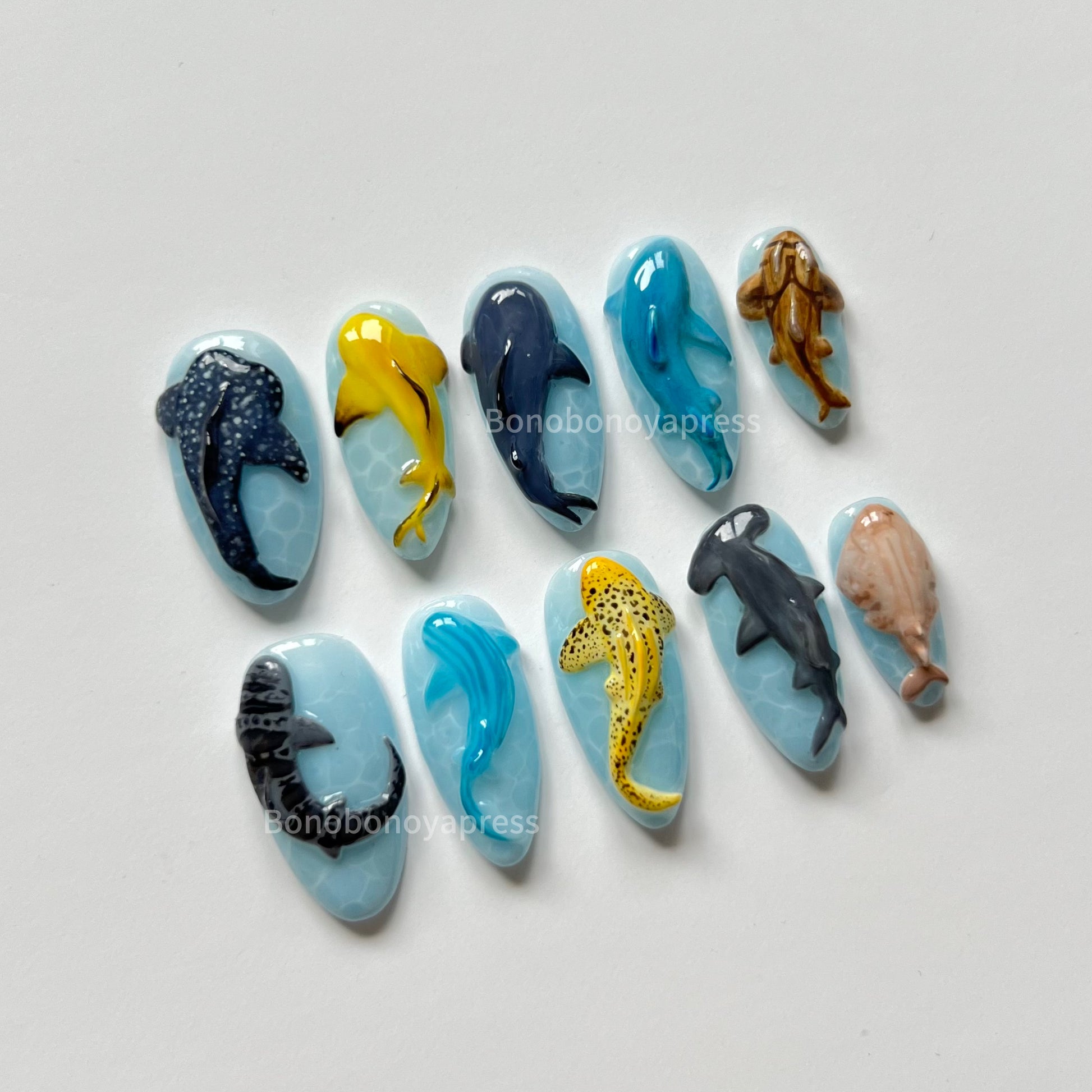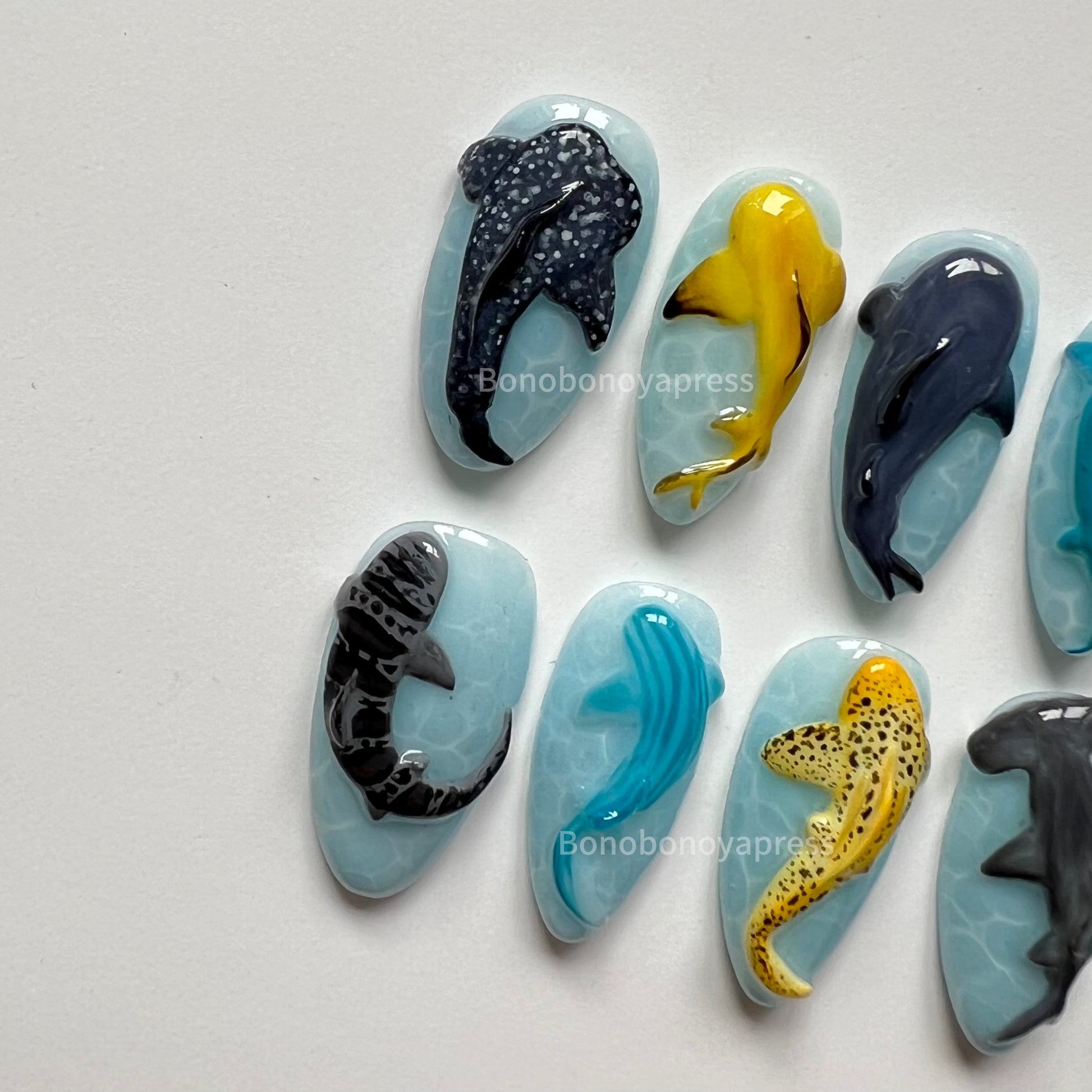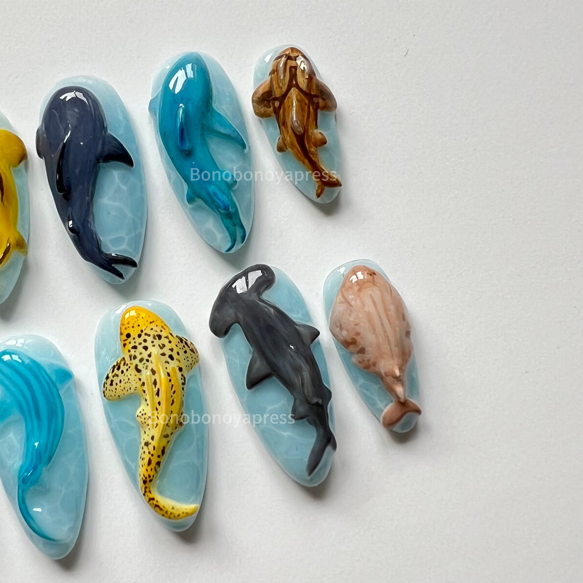 This is a set for Shark lovers. Details include soft water nails, 3D sculpted and hand painted shark species. All species used in this set were individually picked by me to make this set even more unique.