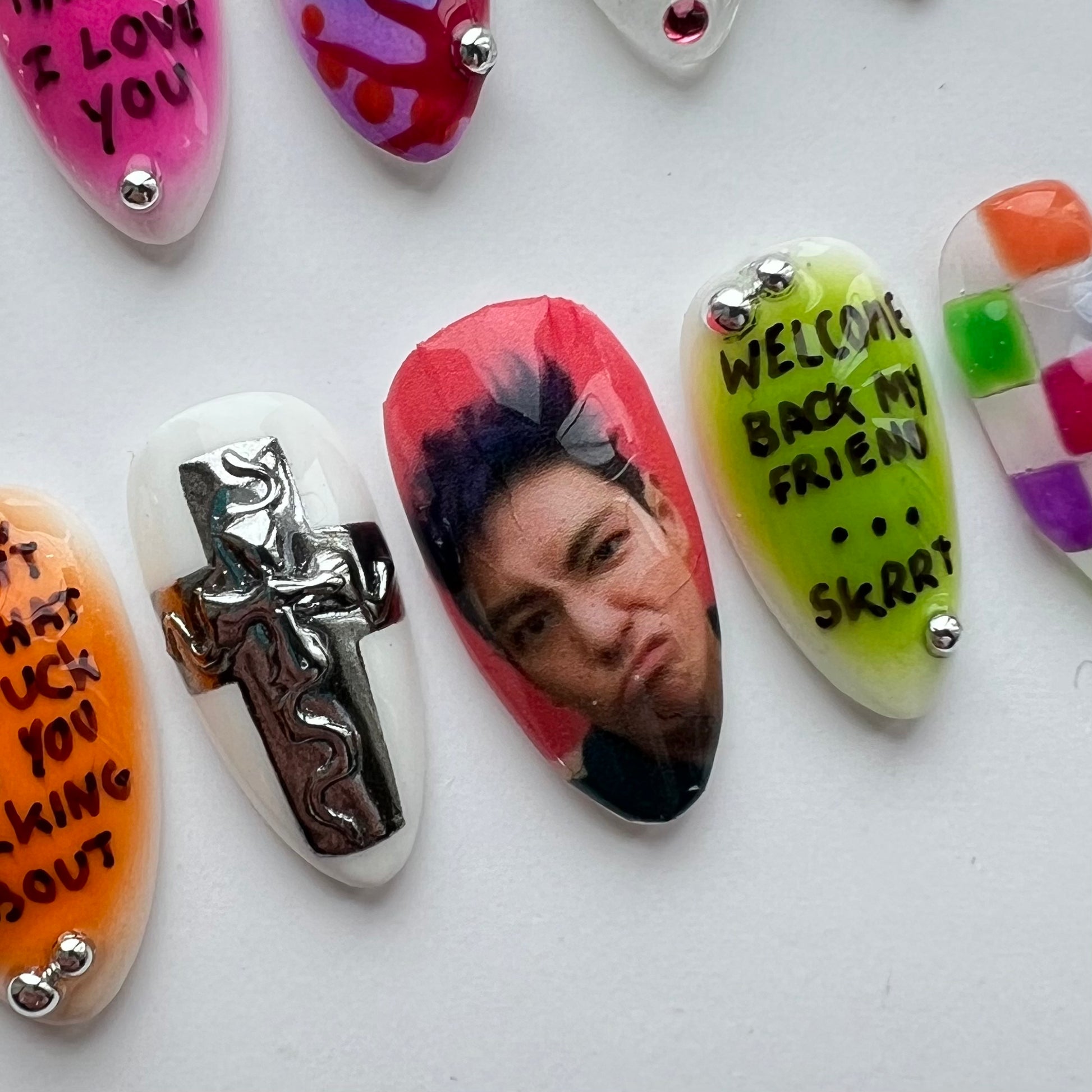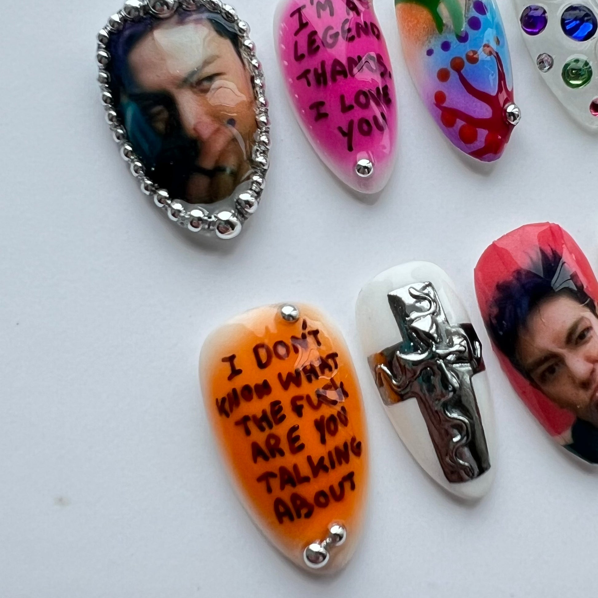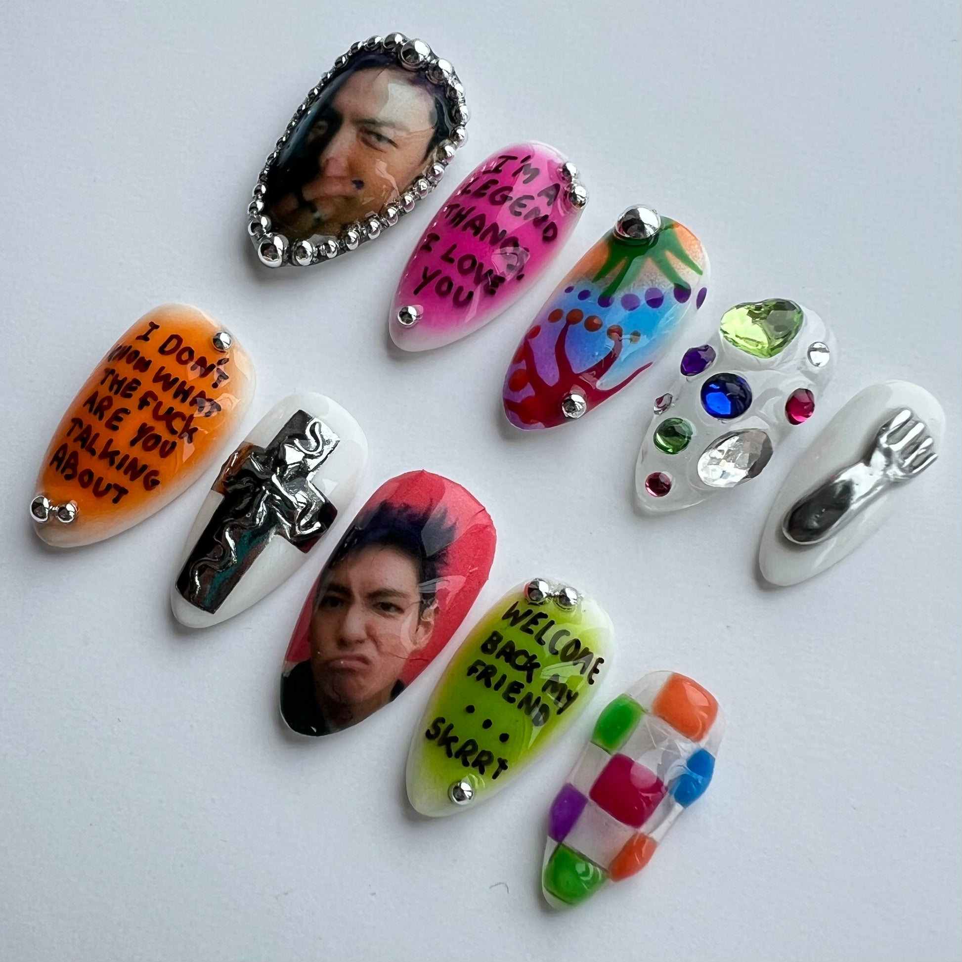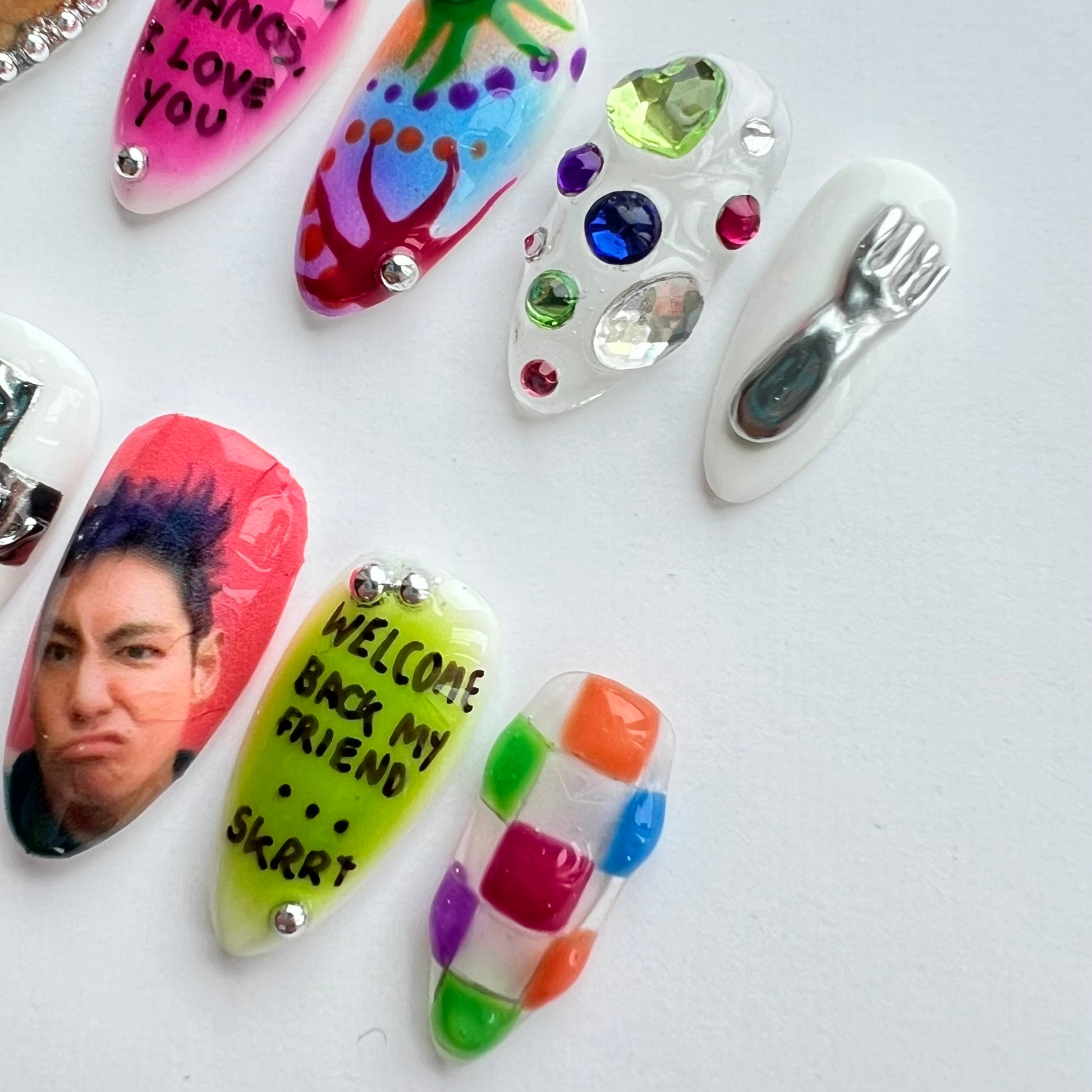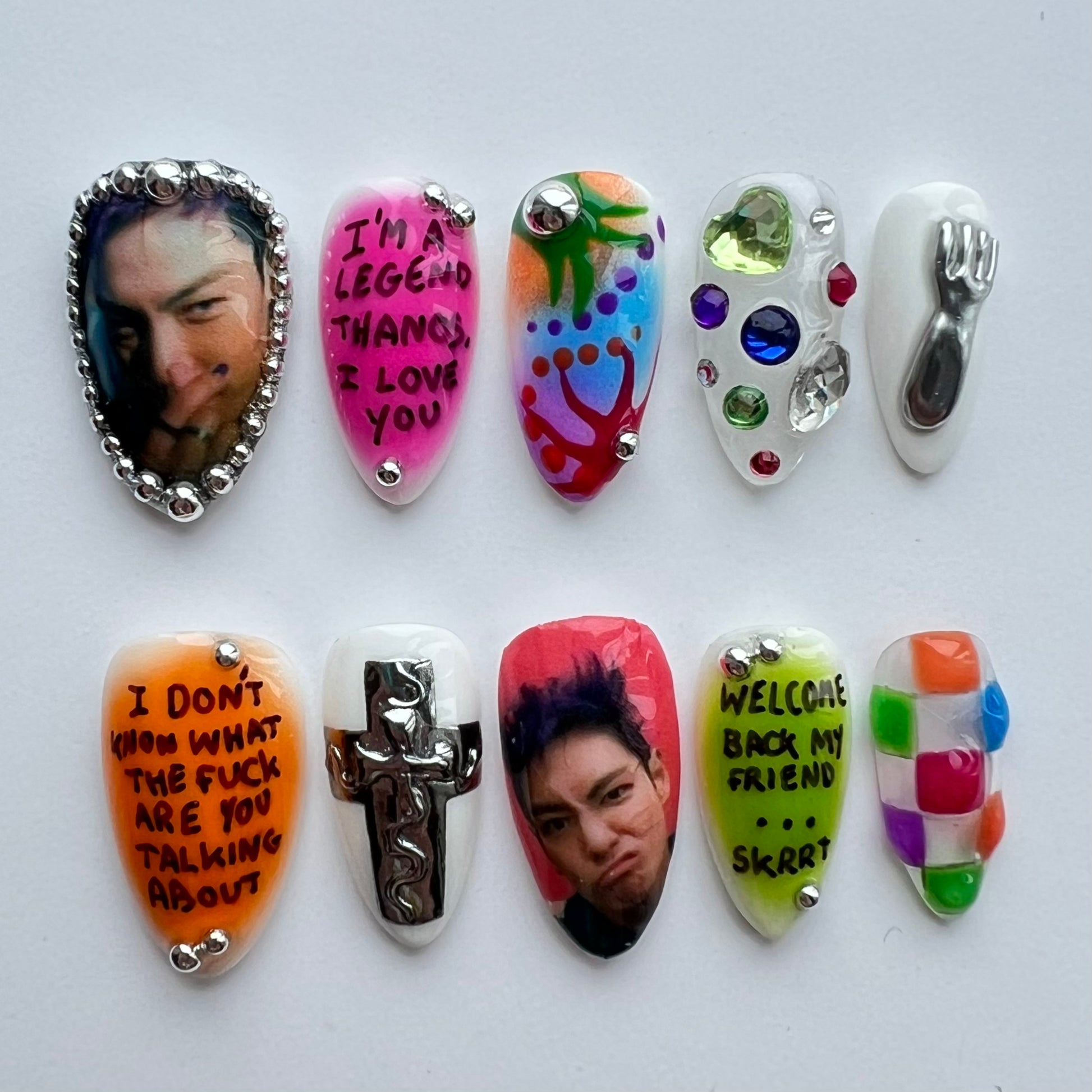 Inspired by the Squid Game series and the chaoticness of Thanos himself. Details include two water decal photo nails, colourful auras, hand written lettering, hand sculpted elements such as the fork (sorry) and silver charms.