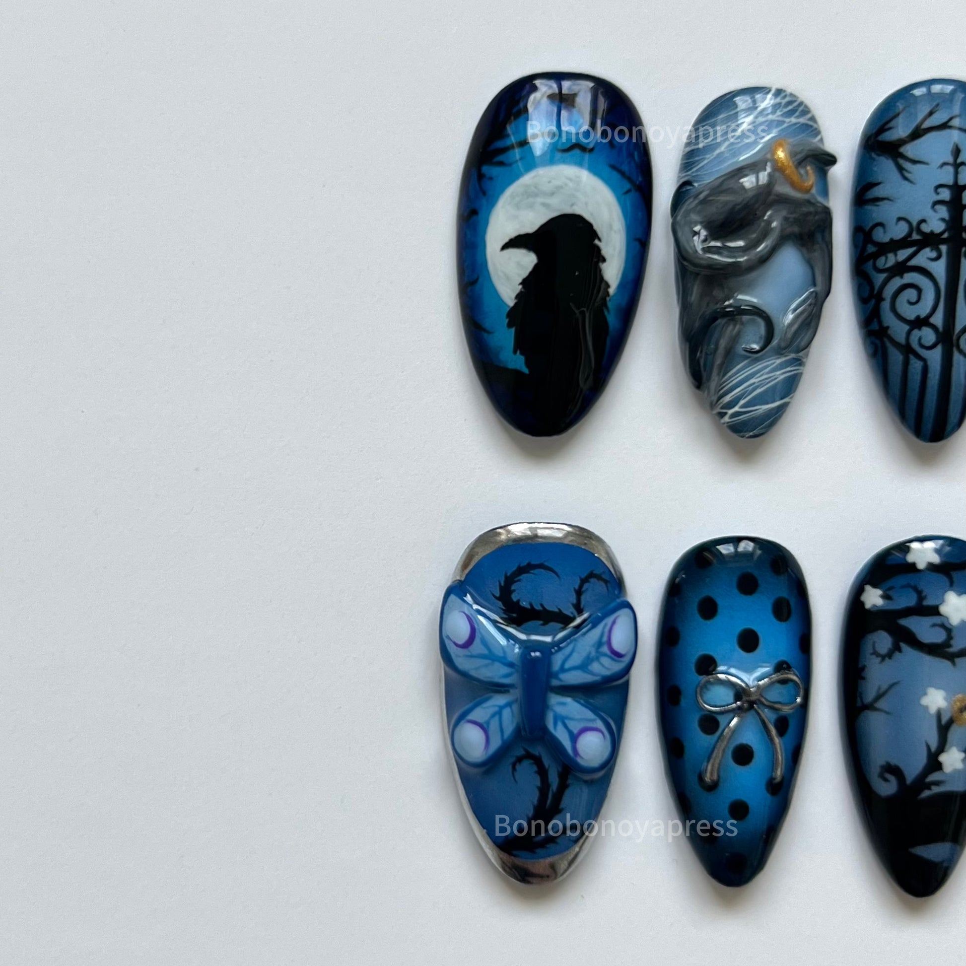 A set inspired by Tim Burton's Corpse Bride. Including details like silver chrome, blue auras and lace details, hand painted art such as the gothic gate and hand sculpted elements like Emily's hand and Scraps the dog.