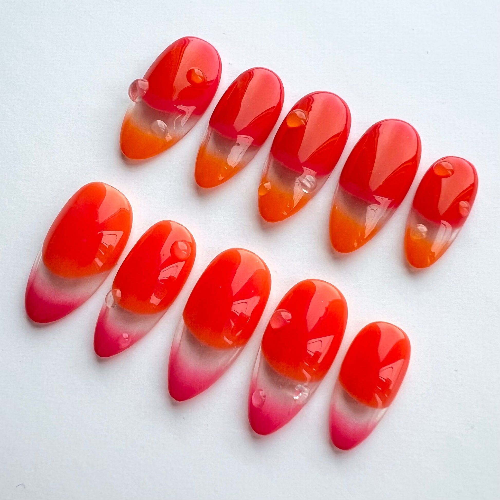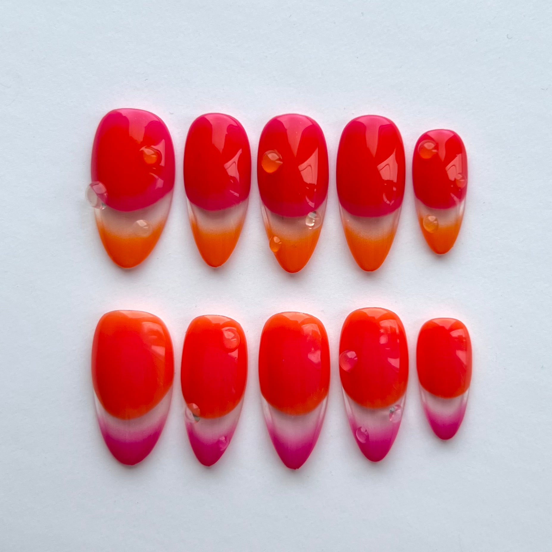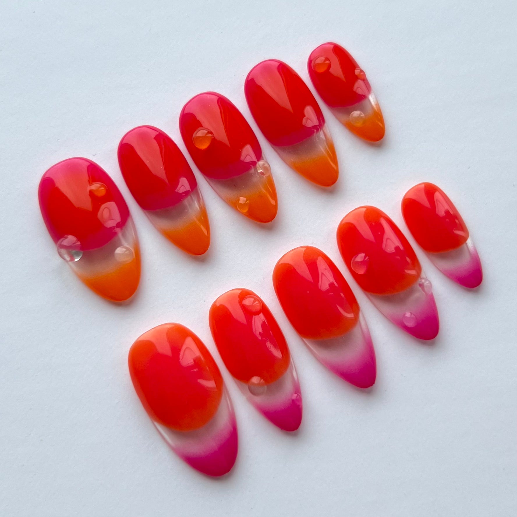 Bright reverse french tips with alternating ombre tips and 3D blobs.