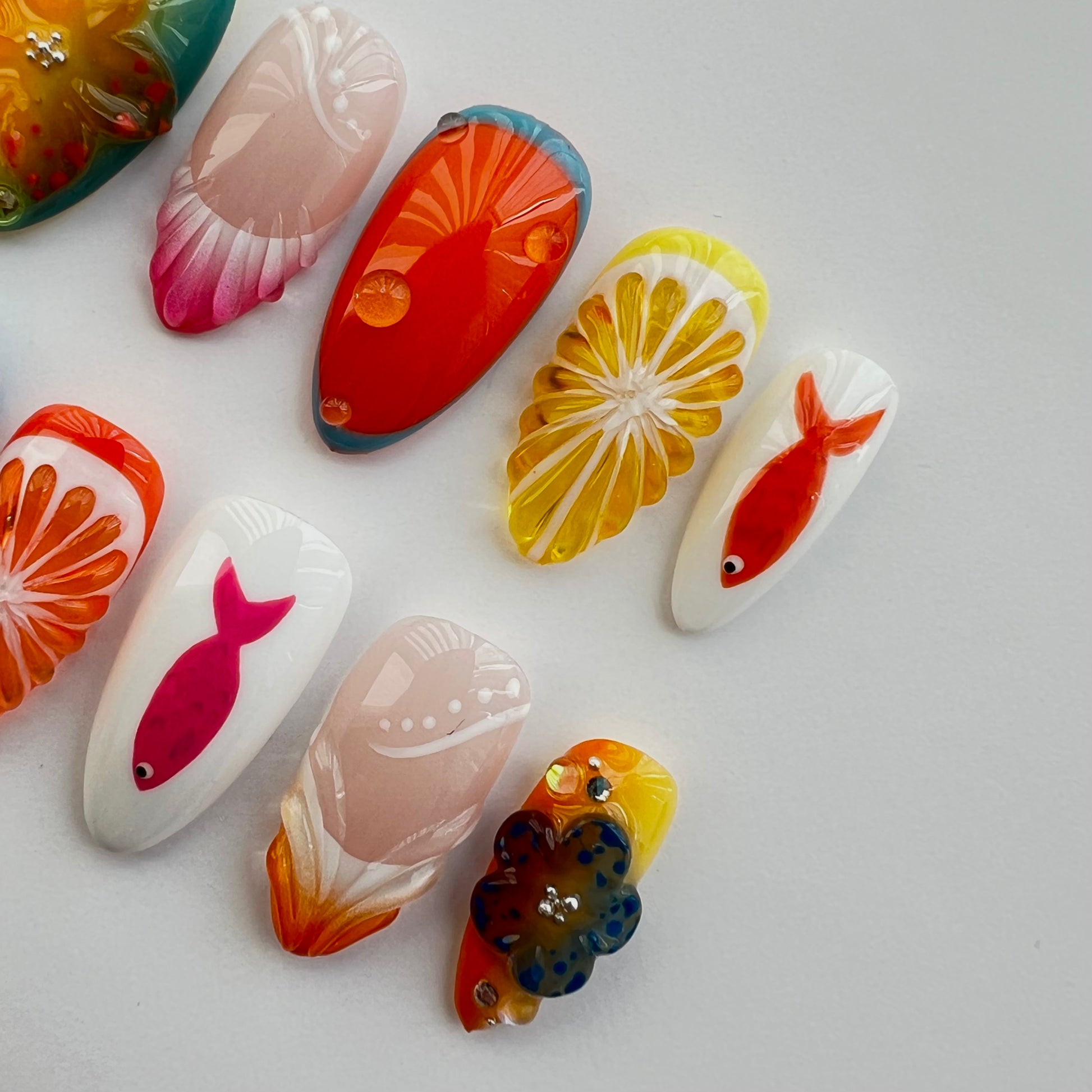 The perfect bright summer set. Including french tips, 3D citrus fruit slices, hand painted fish, auras and hand sculpted jelly flowers.
